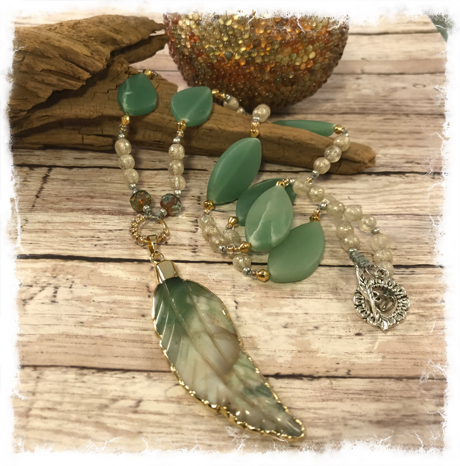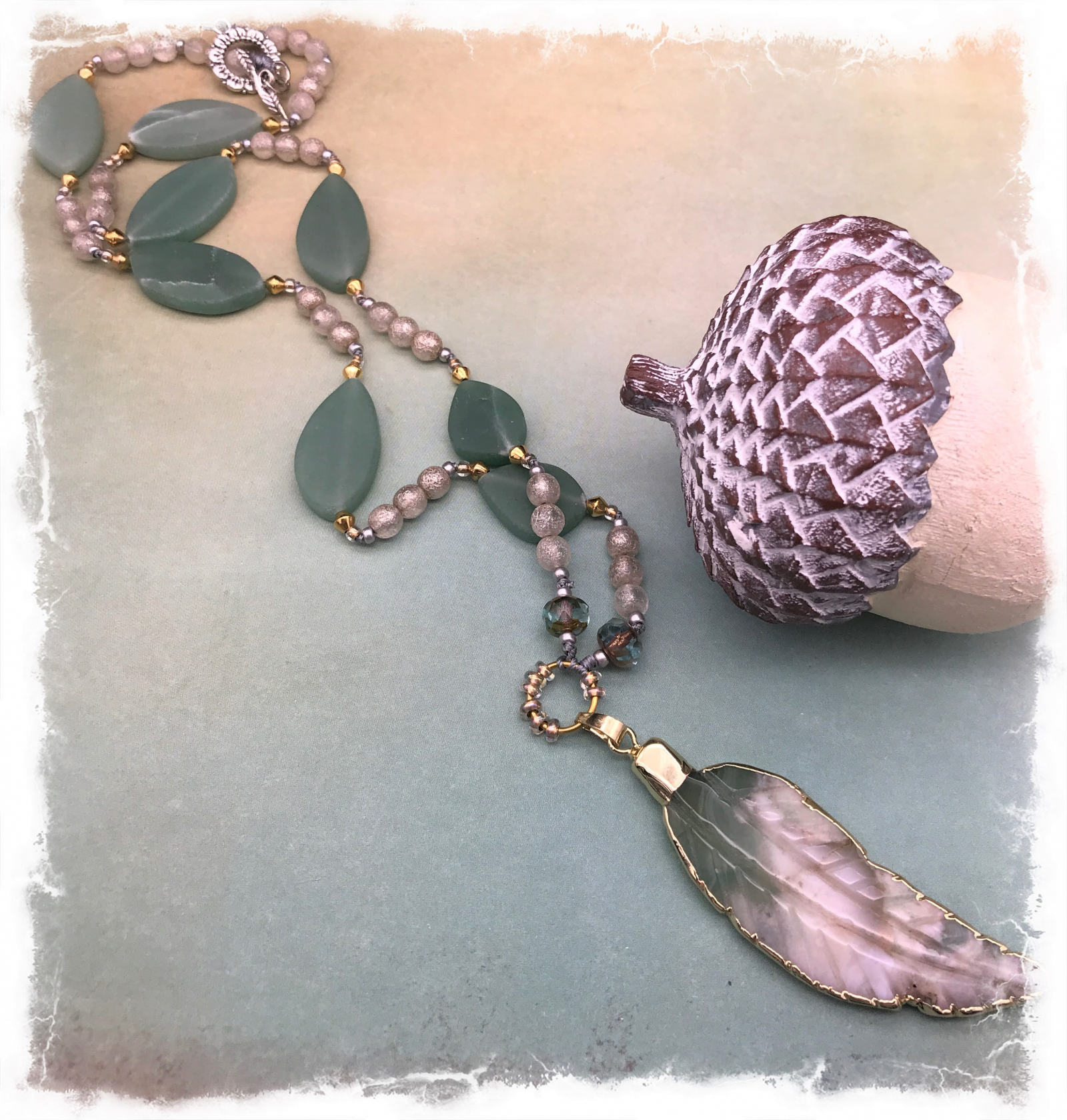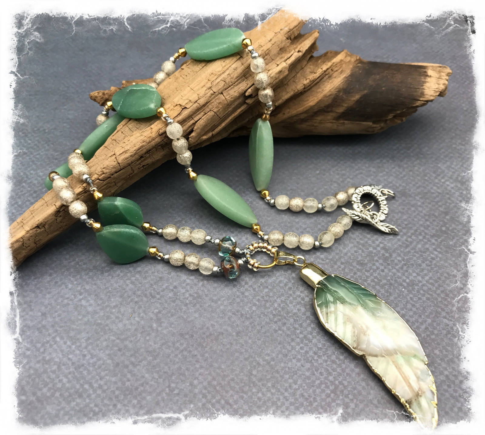 This gorgeous apple blossom agate pendant has been carved into a grafeful feather and edged in plated gold. Just beautiful in shades of dusty sage green, frosted ivory, with hints of pale gray and taupe. I had some lovely matte adventurine marquise shape stones that are a perfect compliment in shape and color, they were meant to play along! It's all hand-knotted on pale gray cord, with pretty frosted round Czech glass beads and tiny gold/brass bicone spacers, along with silver seed beads. It's a great gift idea for you or someone you love. The stone pendant measures nearly three inches and has a large gold cap. The necklace is 26" and ends with a silver plated toggle. Combining a bit of both silver and gold makes it versatile to wear with either color earrings. All of these hand carved stones are unique; you won't see this onw any where else.