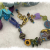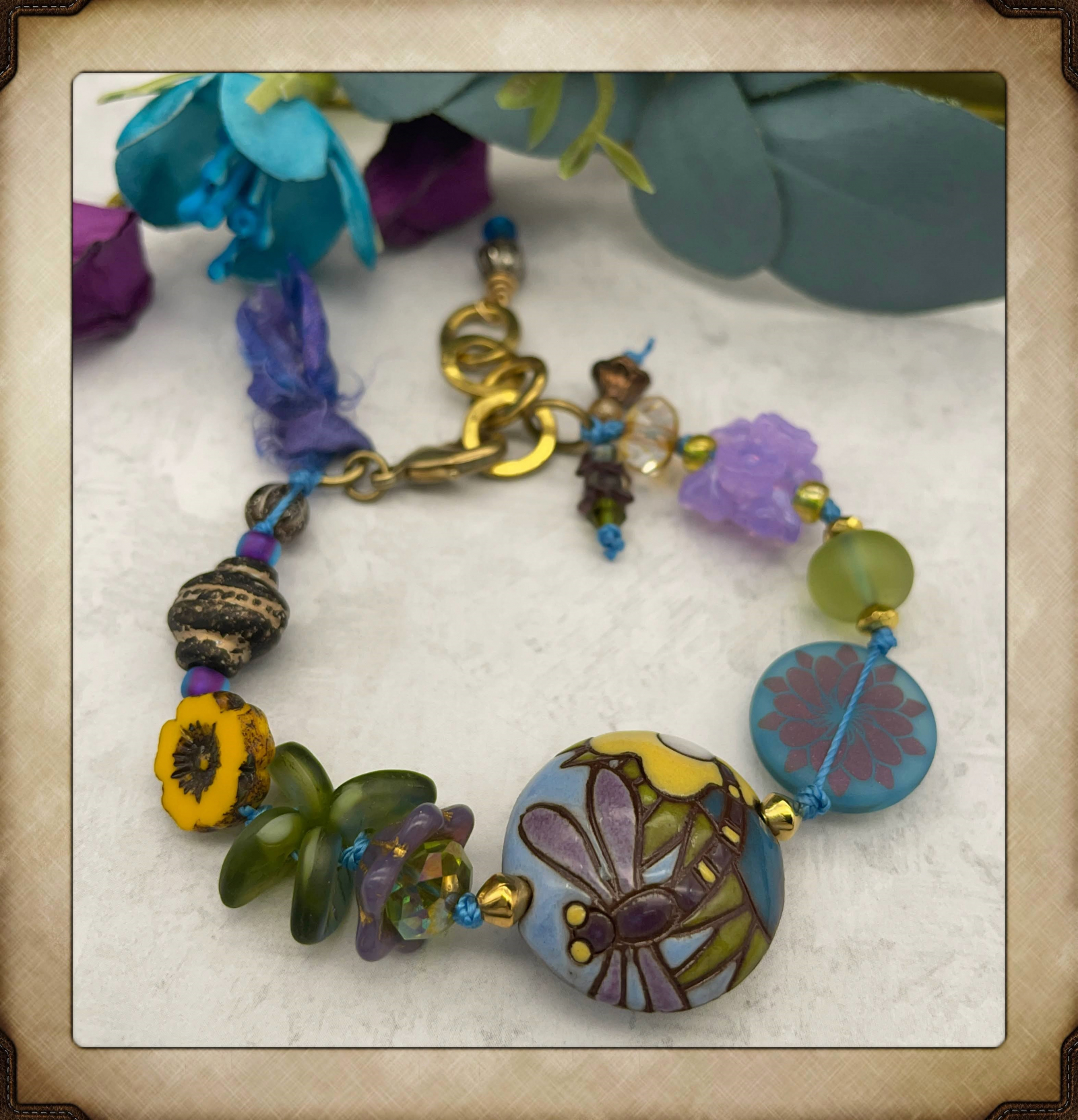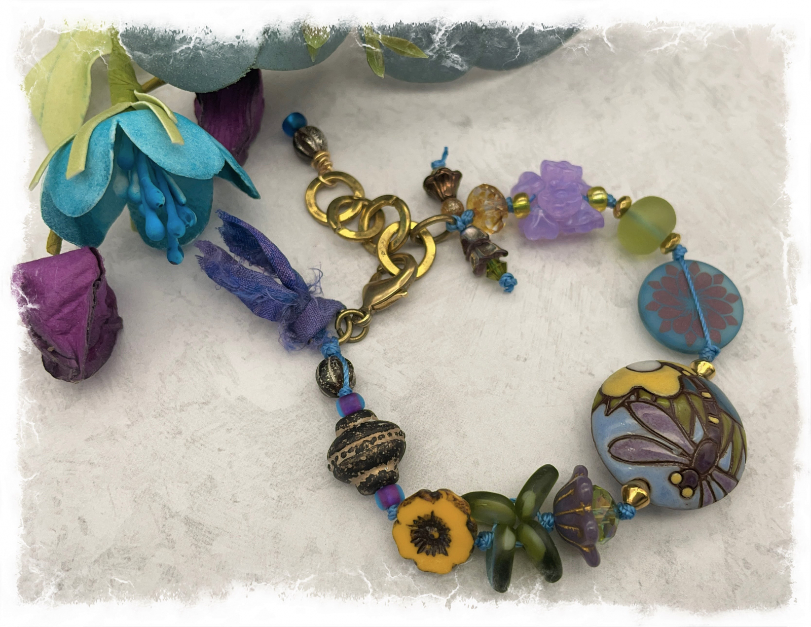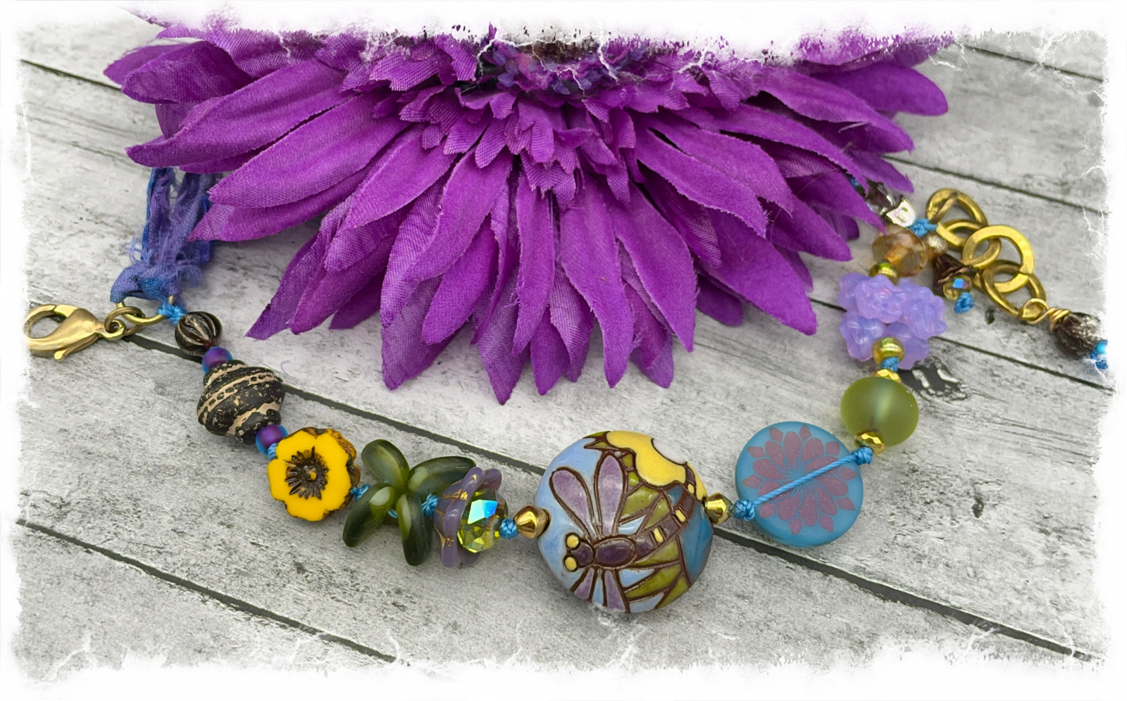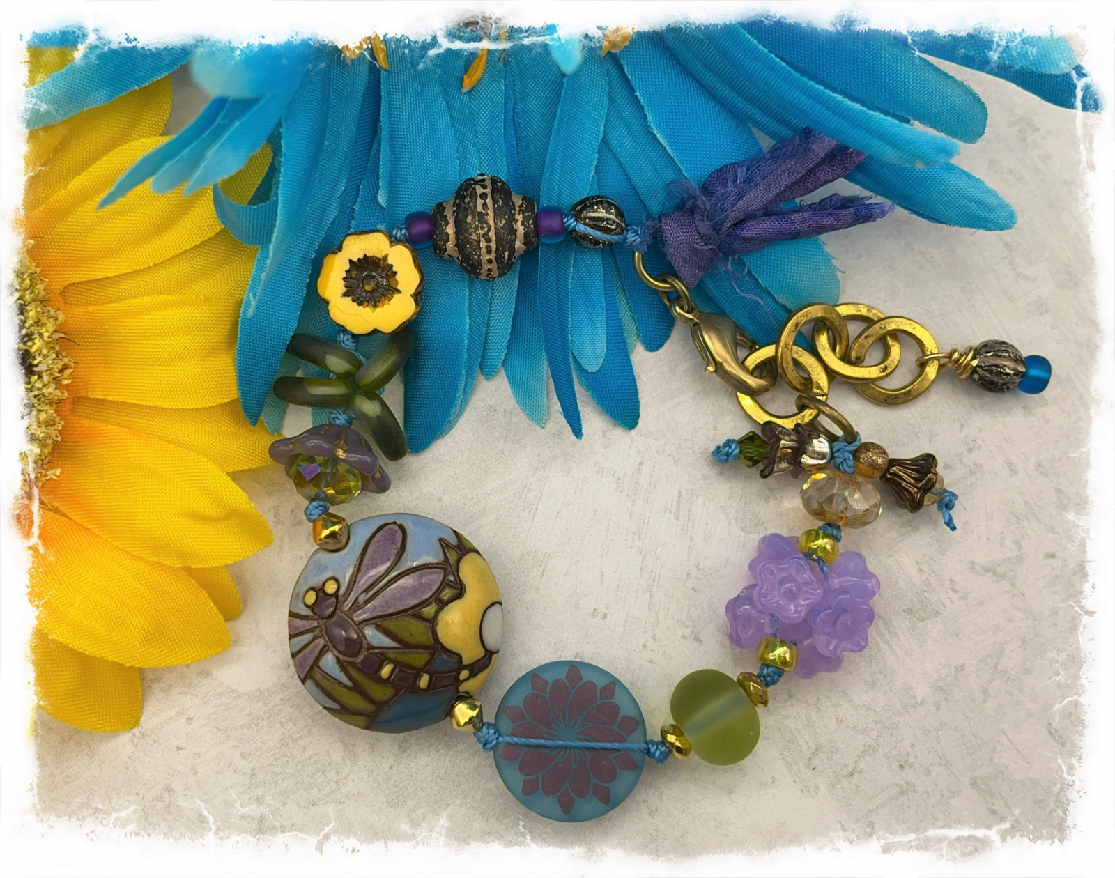 Bring on Spring! Here's a bracelet with a treasure trove of Spring delights: an artisan focal bead from Golem Studios with a pretty dragonfly, Czech glass flowers and beads, vintage lucite, recycled glass, and crystals. It all comes together in a beautiful palette of lavender, yellow, shades of blue, and pale olive green. The bracelet is all hand-knotted on cerulean cord, and it has a brass lobster claw clasp. There's also a bit of vintage brass chain, so the bracelet will easily fit wrists between 7 and 7 1/2". A unique and whimsical creation that is sure to set your heart singing as we look forward to brighter days.