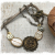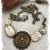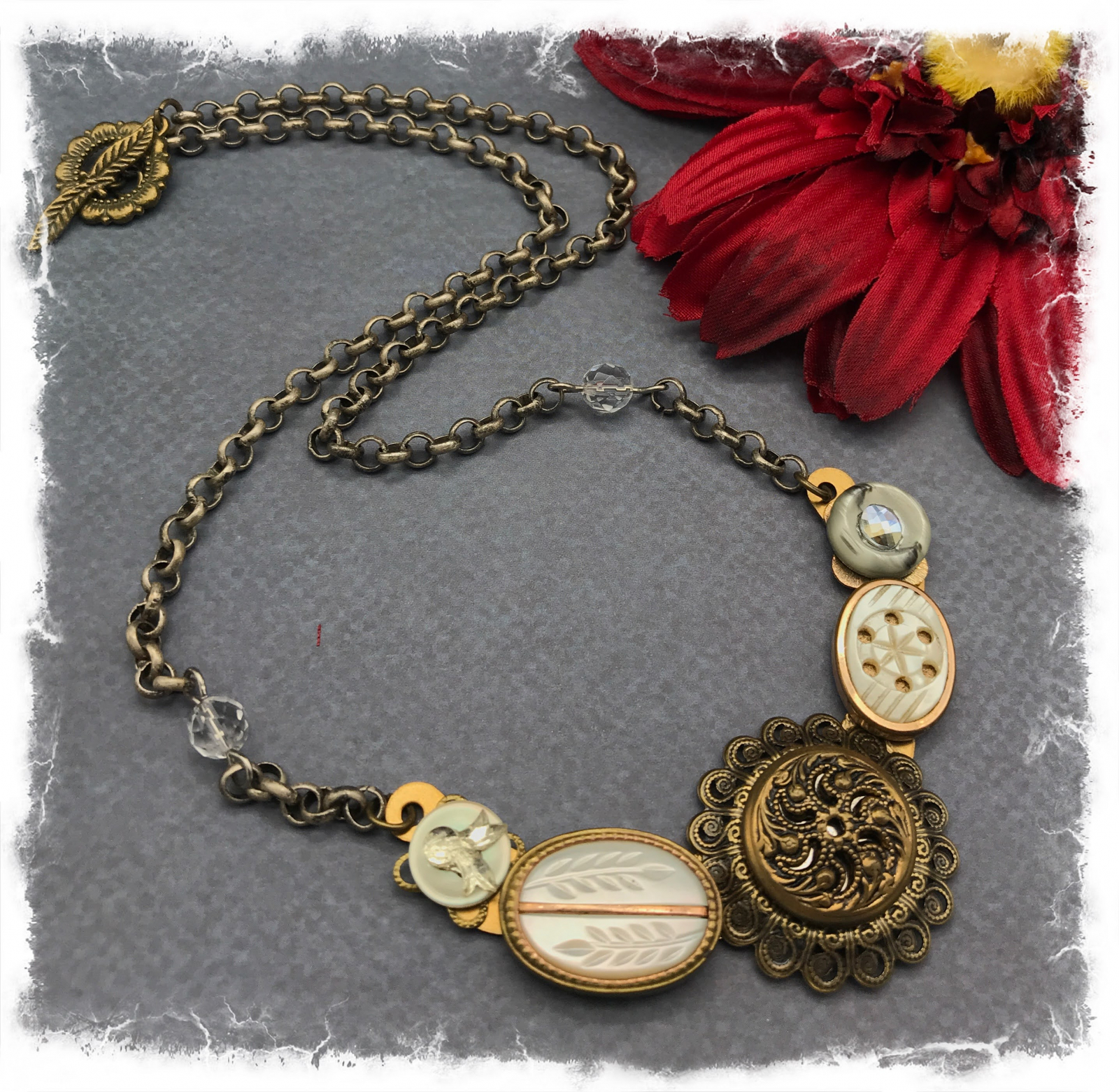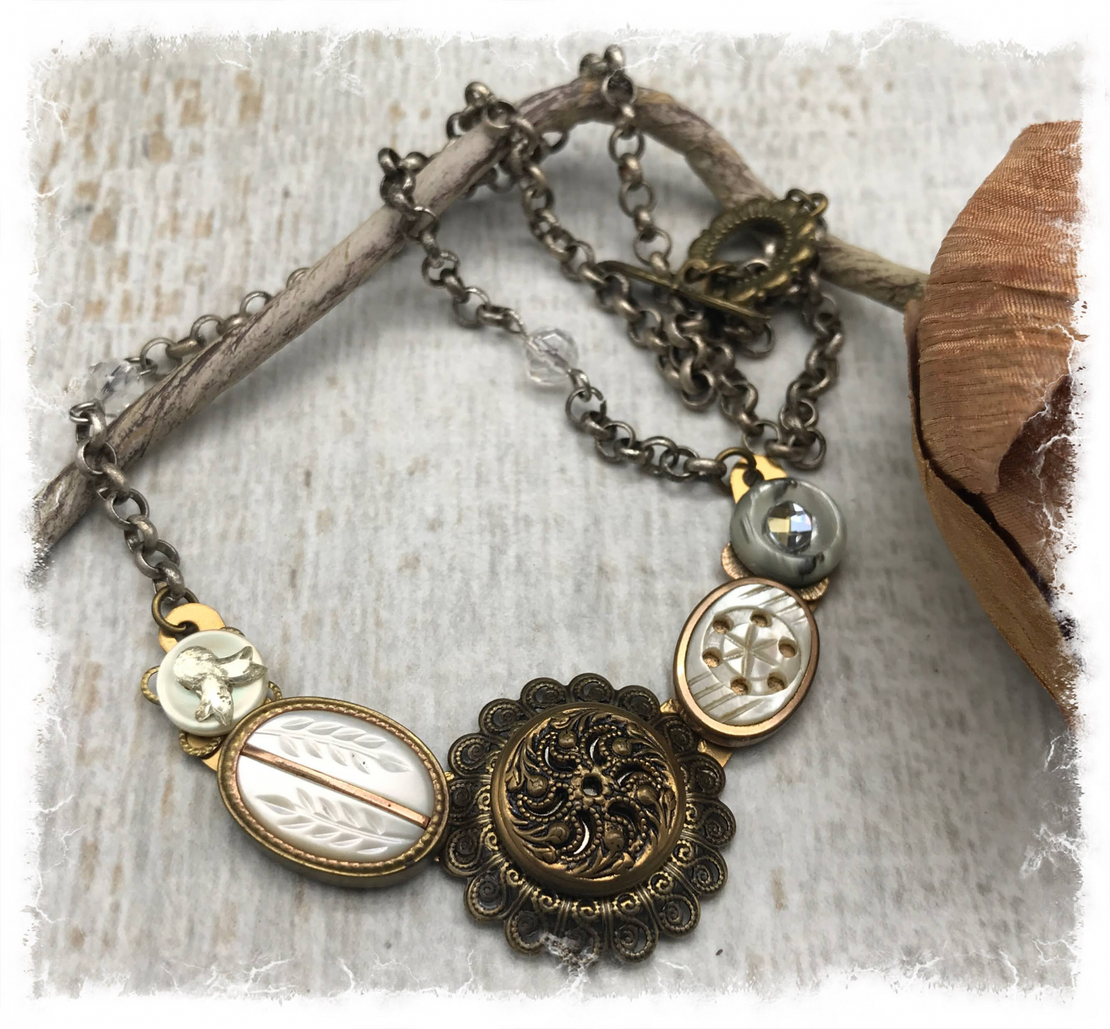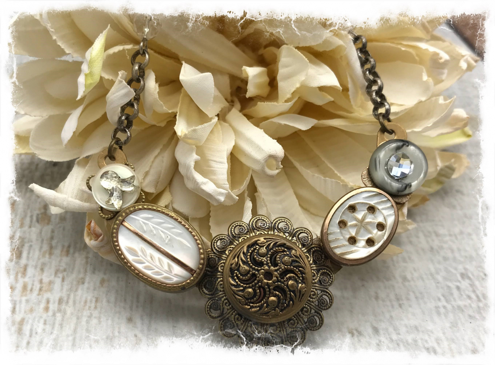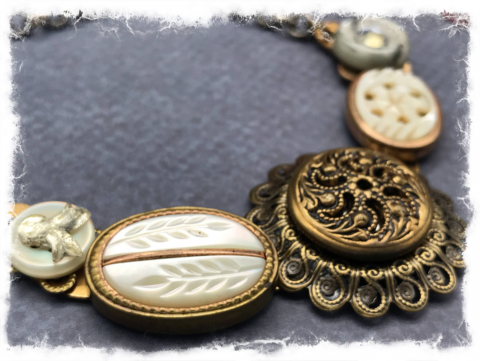 I've always had a fascination with buttons and loved going through my mother's and grandmother's button tins. This unique, pretty assemblage is made entirely of vintage buttons. There are two oval mother-of-pearl buttons with carved accents in brass settings, a filigree mirror back button(popular in the 1940's and prior), set in a round brass filigree base, and two smaller mother-of-pearl buttons. One has an oval crystal and the other a vintage"bow" flat back crustal. They are all set on a half-circle of solid brass. The chain has been antiqued to match and has two vintage Swarovski crystals. This is not a large piece, it's about 2 3/4" wide and an inch deep, but it's a lovely addition to a simple white shirt or a sundress. The chain measures about 18", and it closes with a brass flower toggle. These are very unusual and intricately detailed buttons, and the necklace is truly one of a kind.
