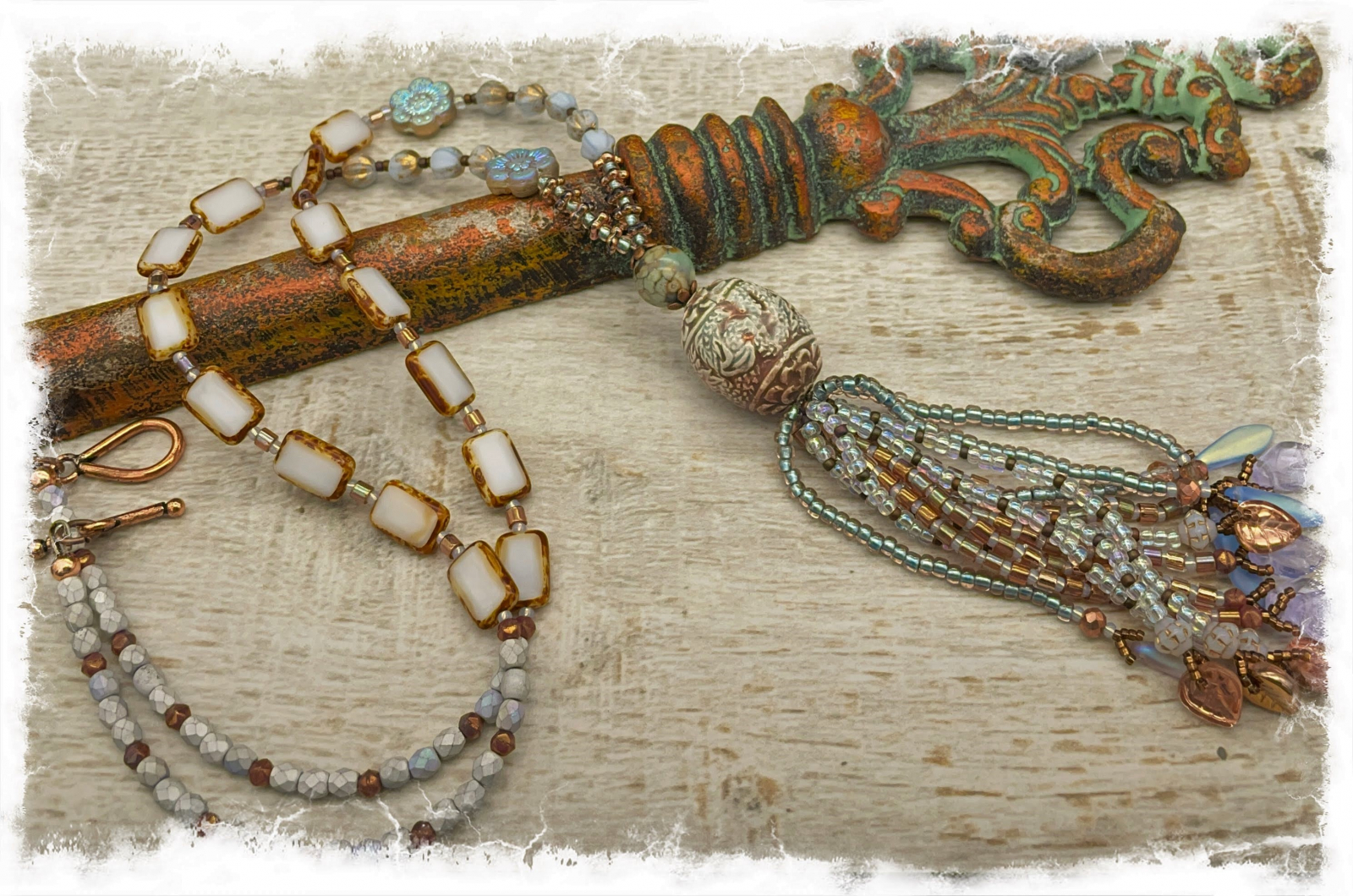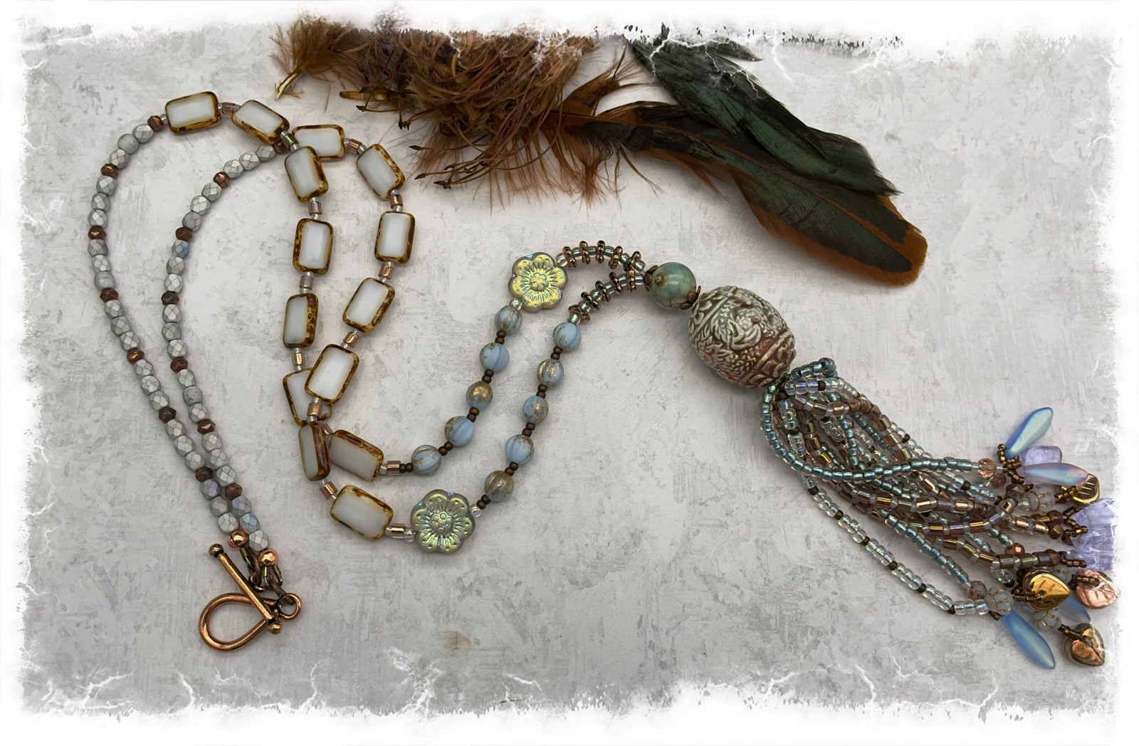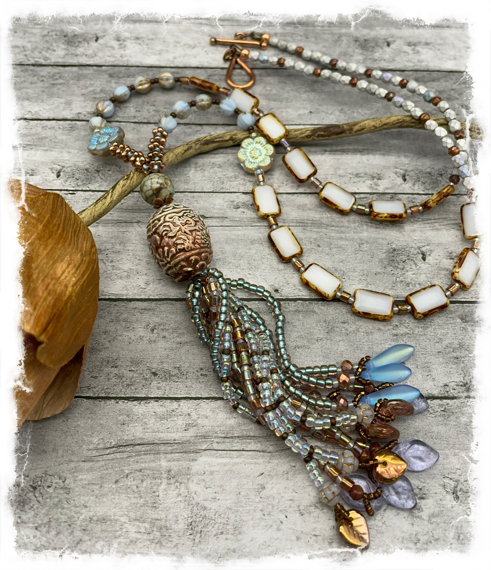 I've had this unique hand made porcelain bead in my stash for some time, i purchase i made in Springdale Utah while on a visit to Zion Natinal park .I loved the colors and texture, but was uninspired to dao anything with it until I bought some new beads recently.. Eh Voila! It all came together in a magical way. The palette is is soothing and a bit mystical - pearlized white, softest blue, light copper, matte silver, and an earthy brown. The necklace is composed entirely of Czech glass, and the pretty hand- sewn tassel has seed beads strands theat end inglass leaves and daggers. wouldn't this be pretty with a chambray or white sundress? The necklace fastens with a solid copper toggle and measures about 34" long, the tassel and focal bead come in at 4". This is the perfect way to welcome a new seaso!