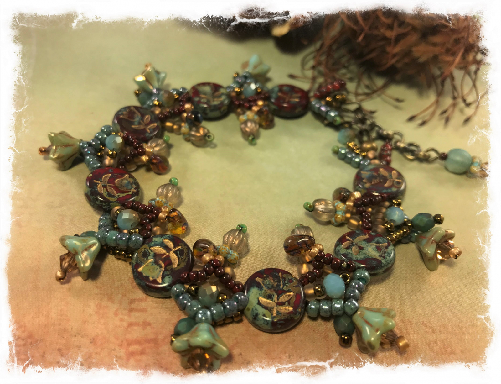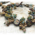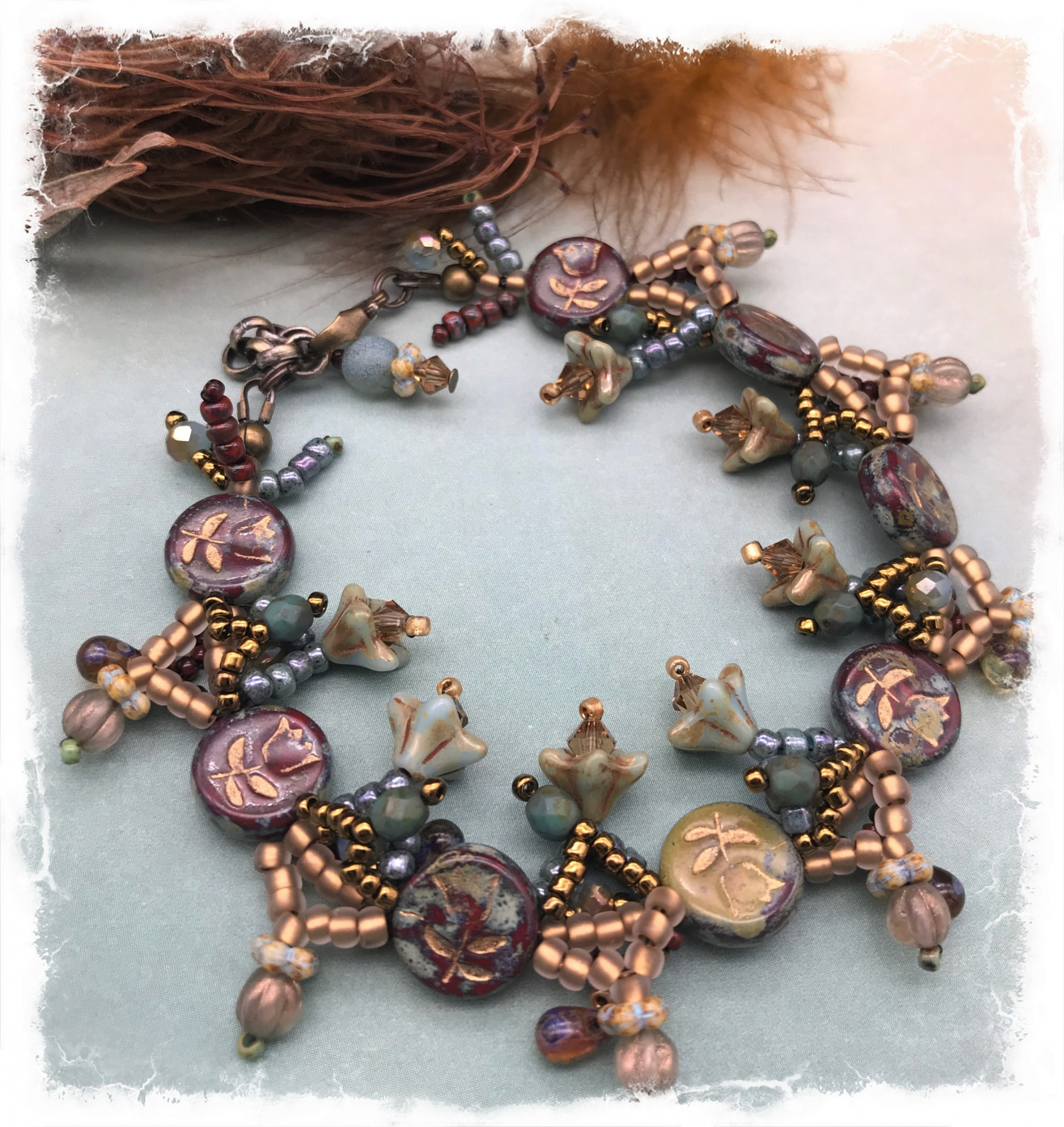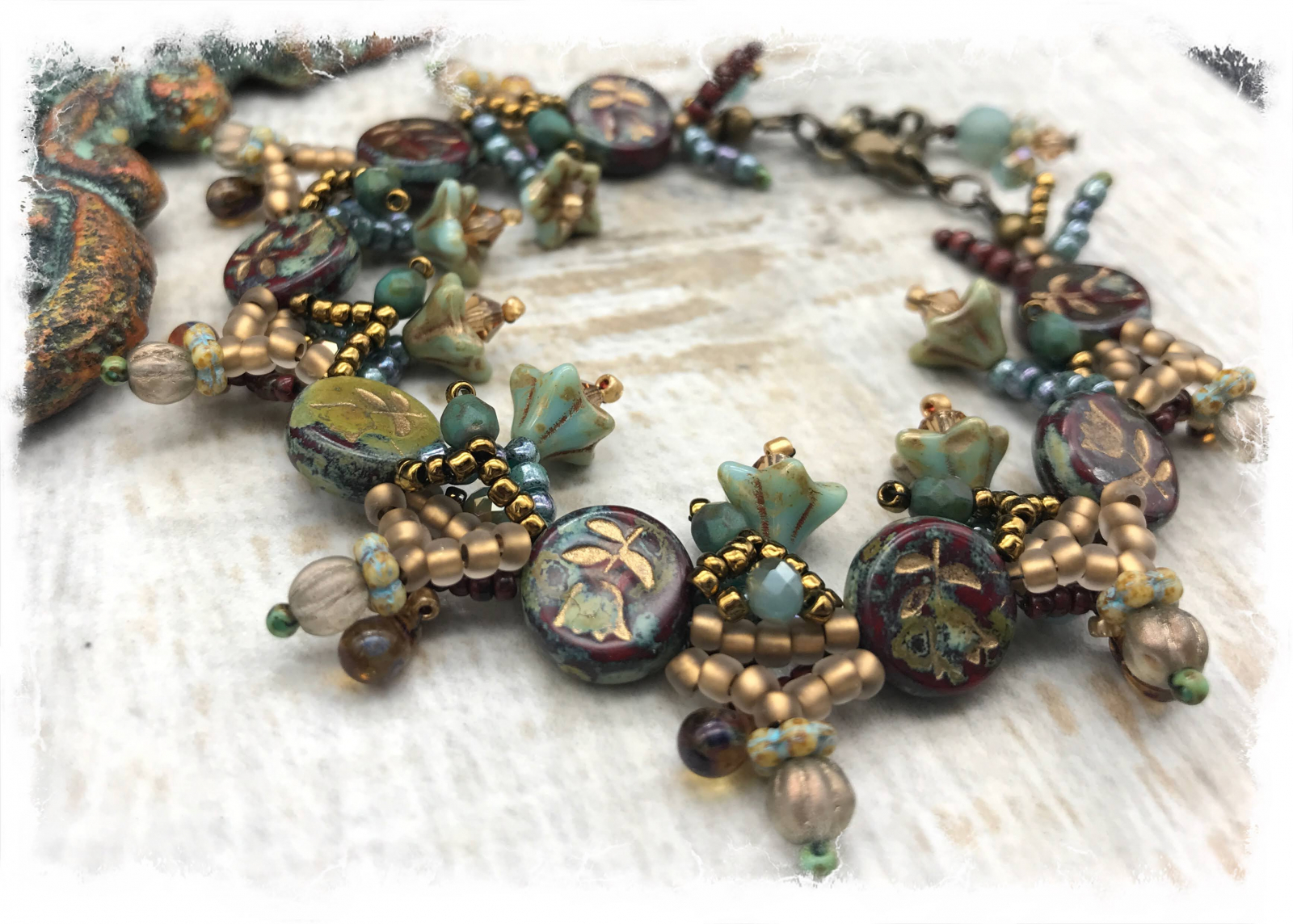 A favorite palette gets to show off in this bead woven bracelet. Stations of picasso finish red tulip beads are strung along the length of it, with Czech glass embellishments in between each one. It features flower cups, melon beads, daisy spacers, and tiny drops along with Swarovski bicones in dark red, amber, dusty turquoise, bronze, and gold. This is such a unique design and so much textural interest. The bracelet has a lobster claw clasp and a bit of extender chain, and will best fit a 7 1/2 to 8 1/4" wrist. Credit to Heather Powers for design idea.