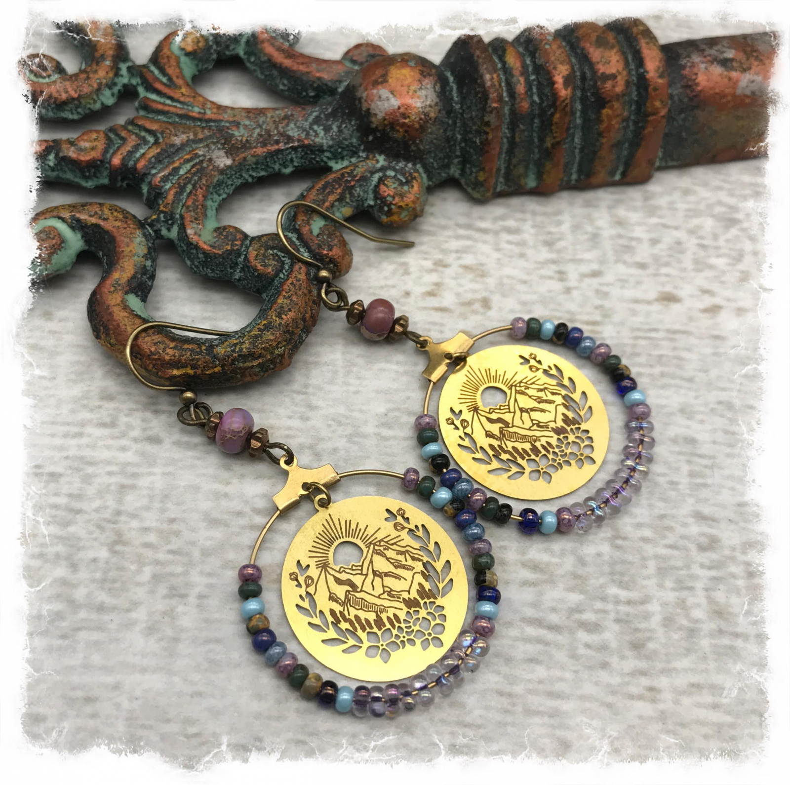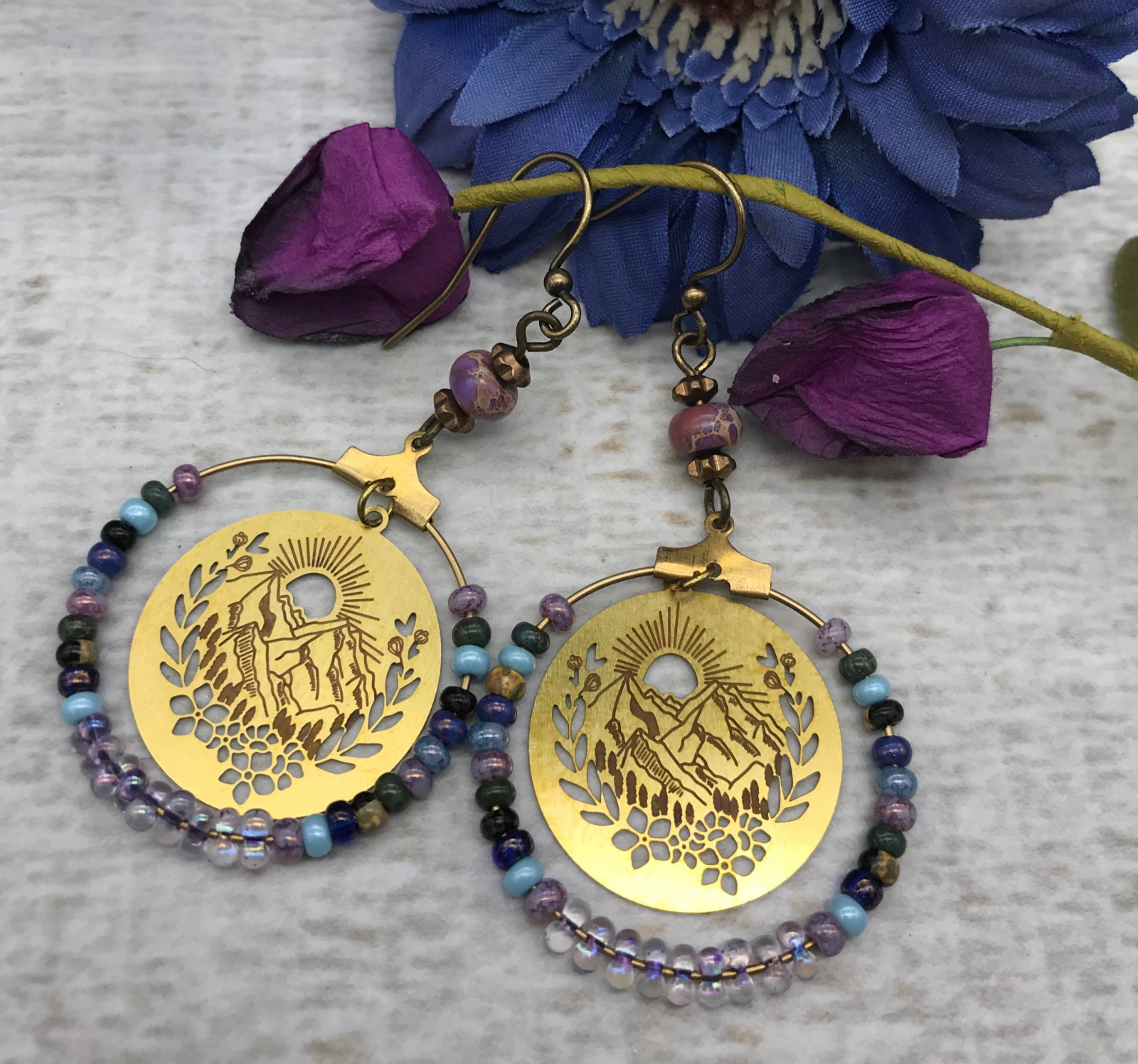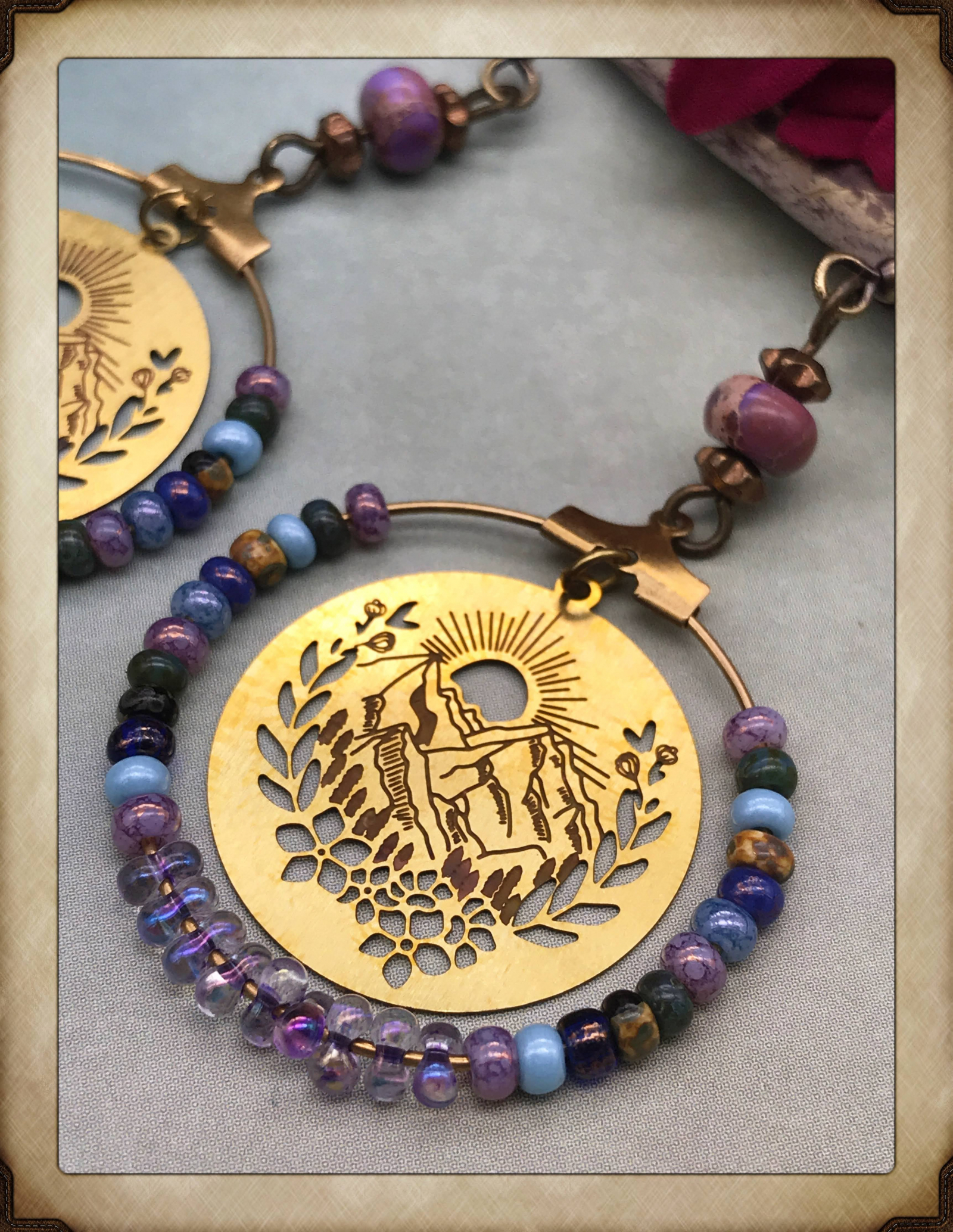Pierced and etched brass charms with a lovely mountain view are at the center of these boho-style layered earrings. The charms float inside a brass ring embellished with seed and peanut beads in shades of soft lavender, blue, and periwinkle. At the top of each is a purple jasper stone and brass flower spacers. Lead and nickel-free brass ear wires complete the earrings. About 2 3/8" long including the ear wires, and they are so light and comfortable!