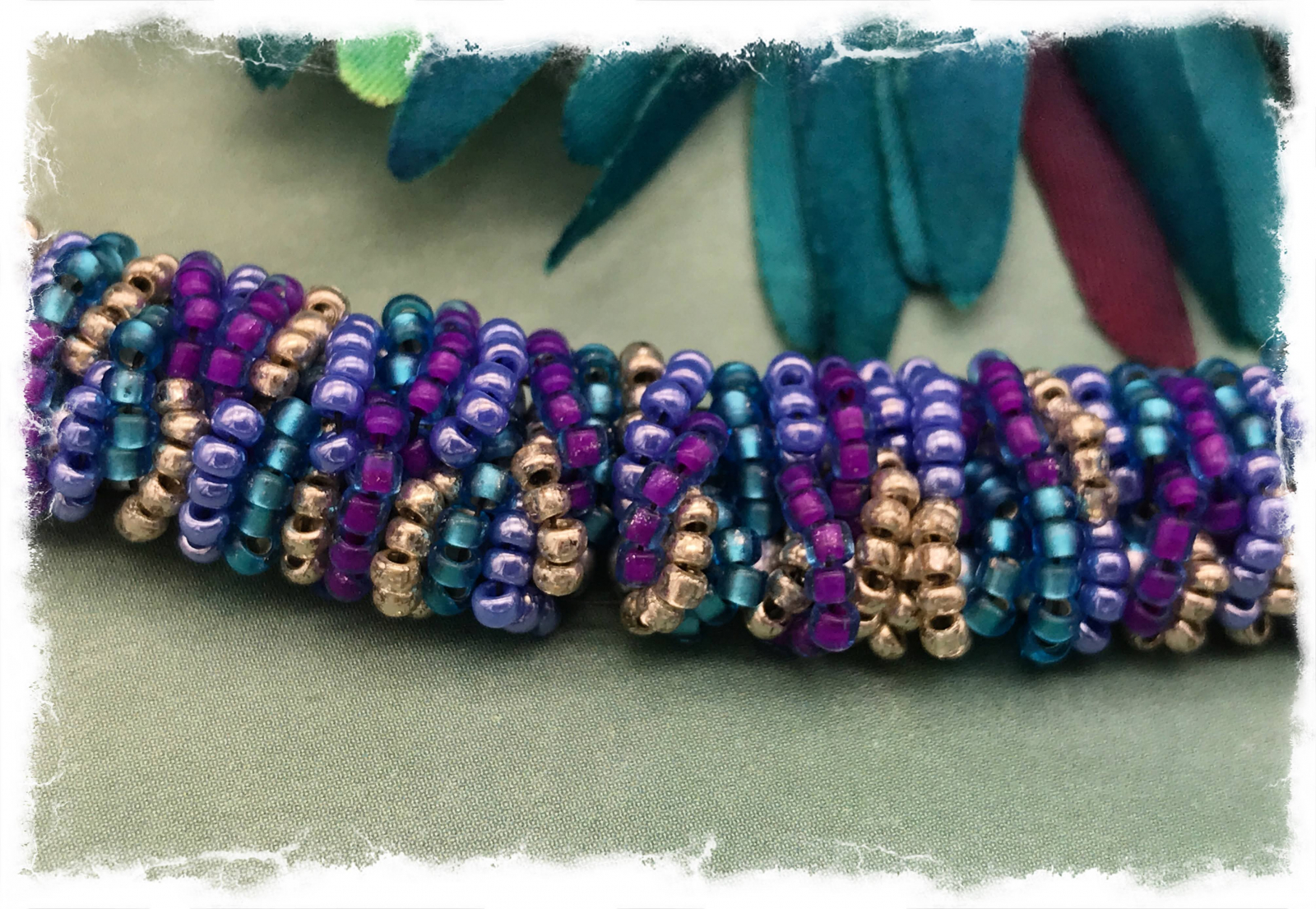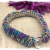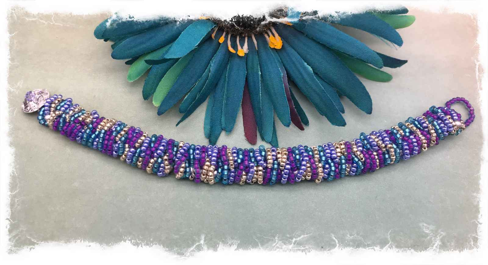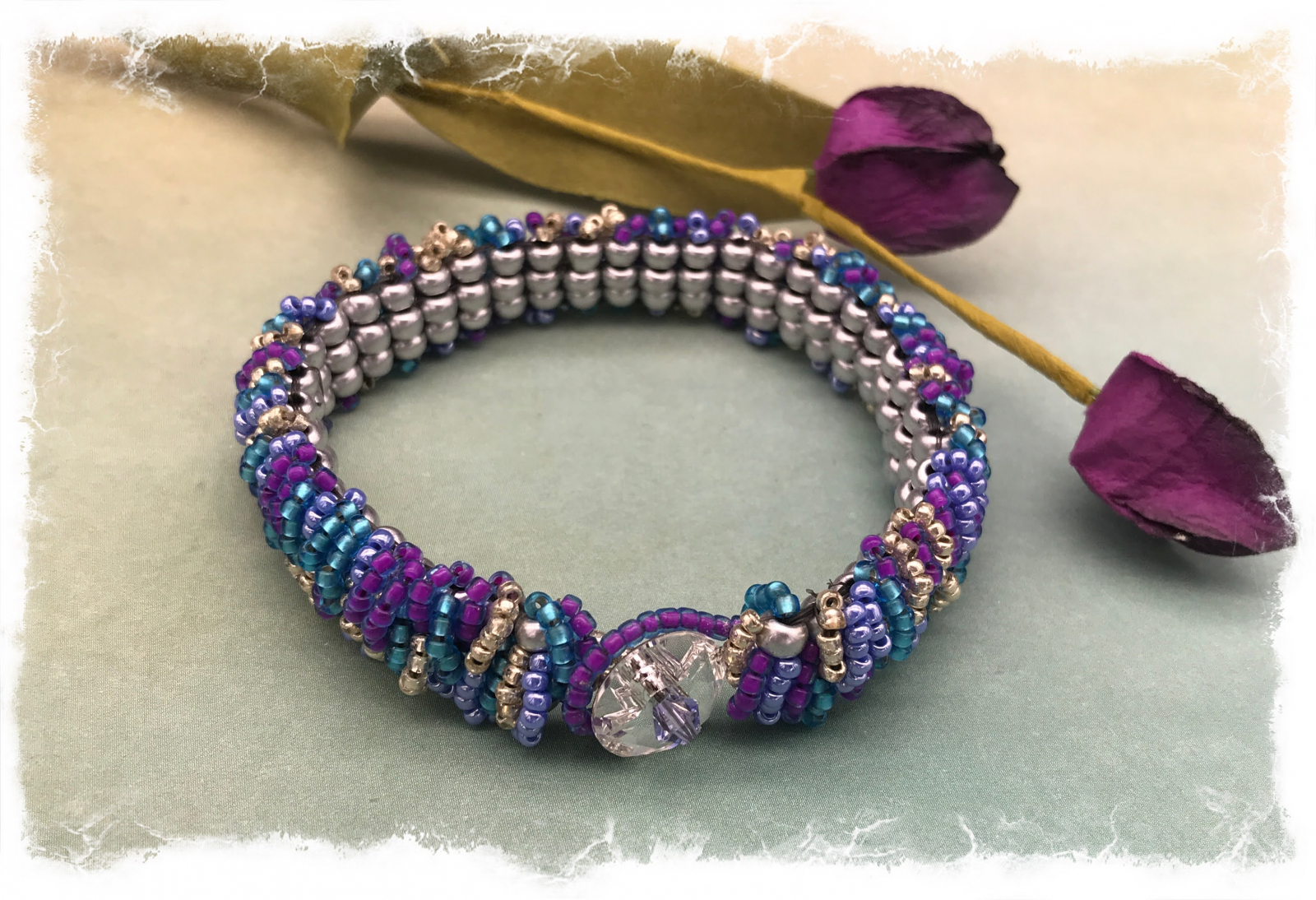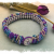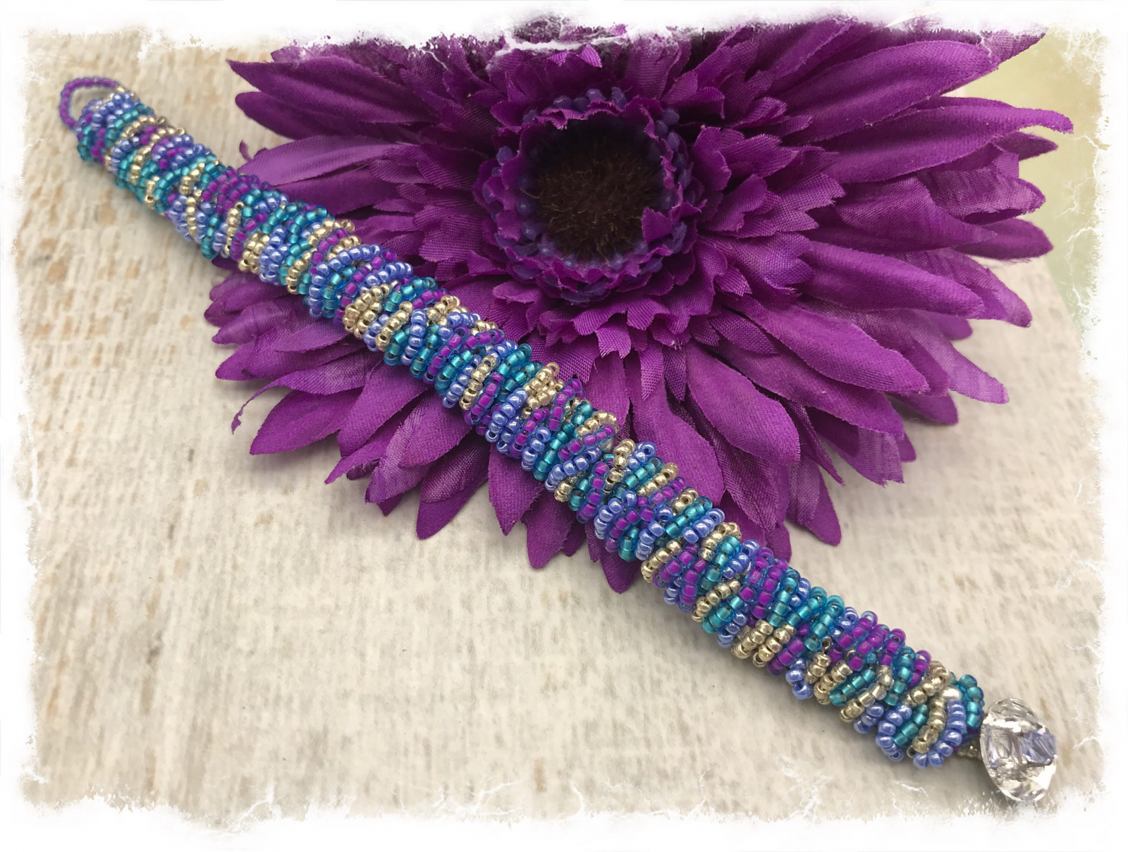 The pattern for this bracelet is called "stashworm" and it's meant to be a way to use up bits and pieces of left over beads, lol! I could make dozens of these; the end result is so pretty and fascinating. The color combo of blue-lines purple, silver, periwinkle, and light teal just absolutely pops. It wears almost like a bangle and is super comfortable. I have finessed with a clear Swarovski crystal button and loop. The bracelet is about 1/2" wide and will best fit a 7 1/2 to 7 3/4" wrist. Pattern credit: Sam Wescott