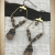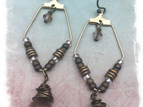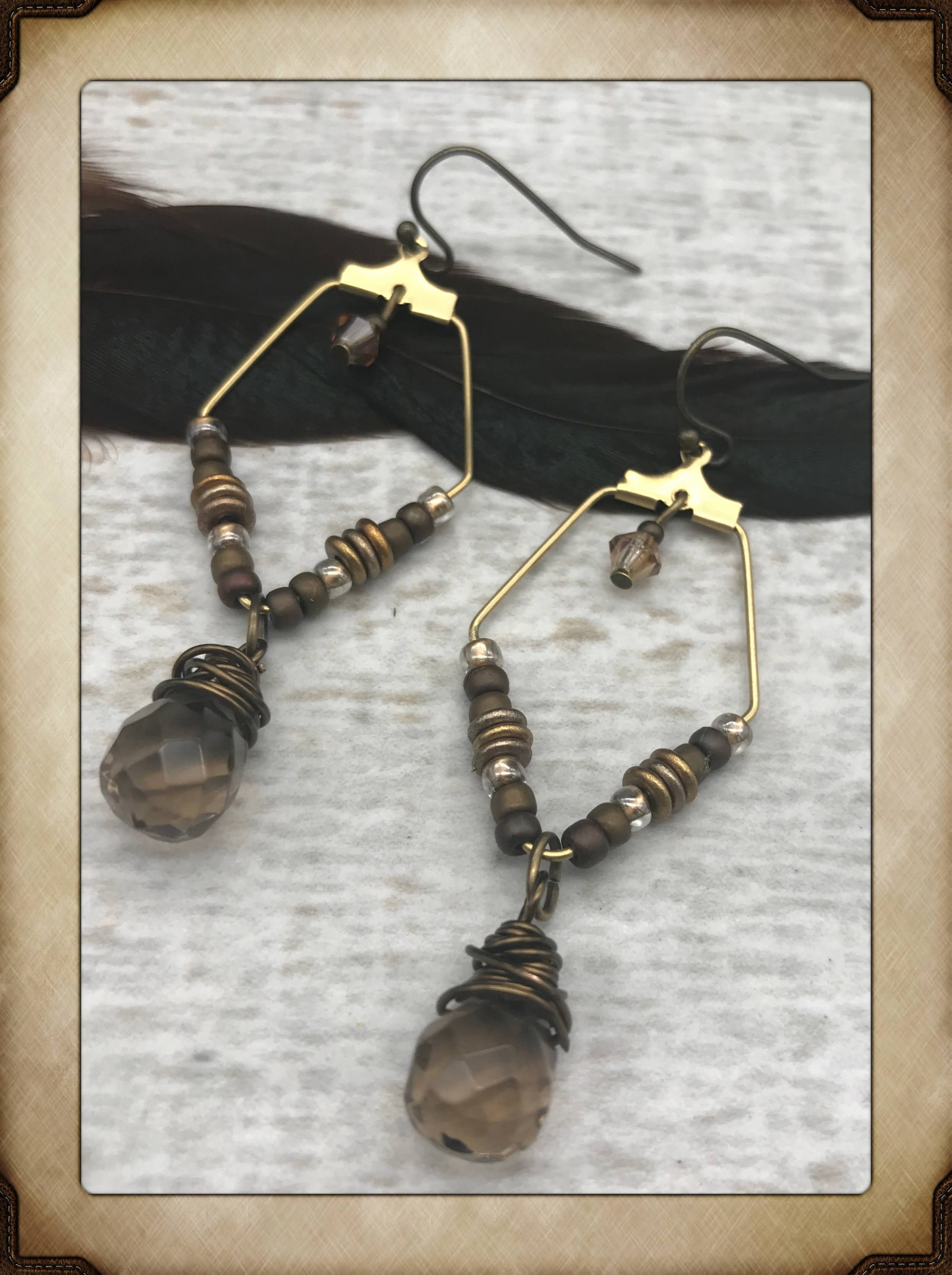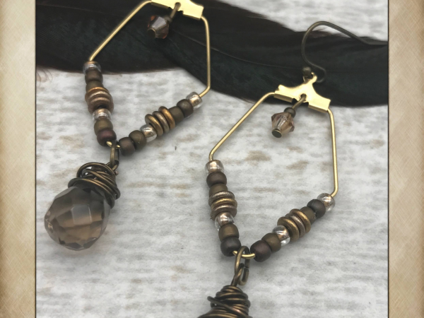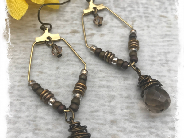 These sublimely neutral earrings are done in a palette of earthy browns, dark gold, and bronze and are great for everyday elegance. They feature faceted smokey topaz gemstone drops wired -wrapped in antique brass wire. The drops are suspended from geometric brass hoops tht I've embellished with tinu glass seed beads. Each earrings also has a small Swarovski crystal. They're terrific blend of modern and earthy. The earrings measure about 2 1/4" including the brass ear wires and are wonderfully lightweight.