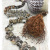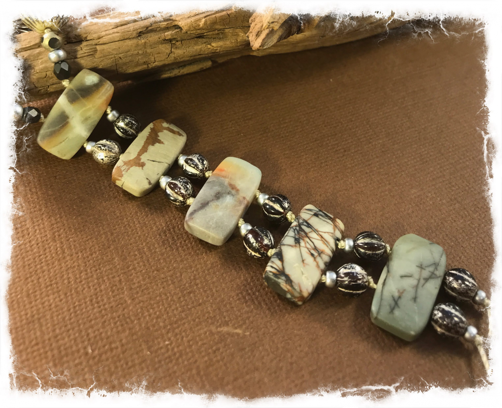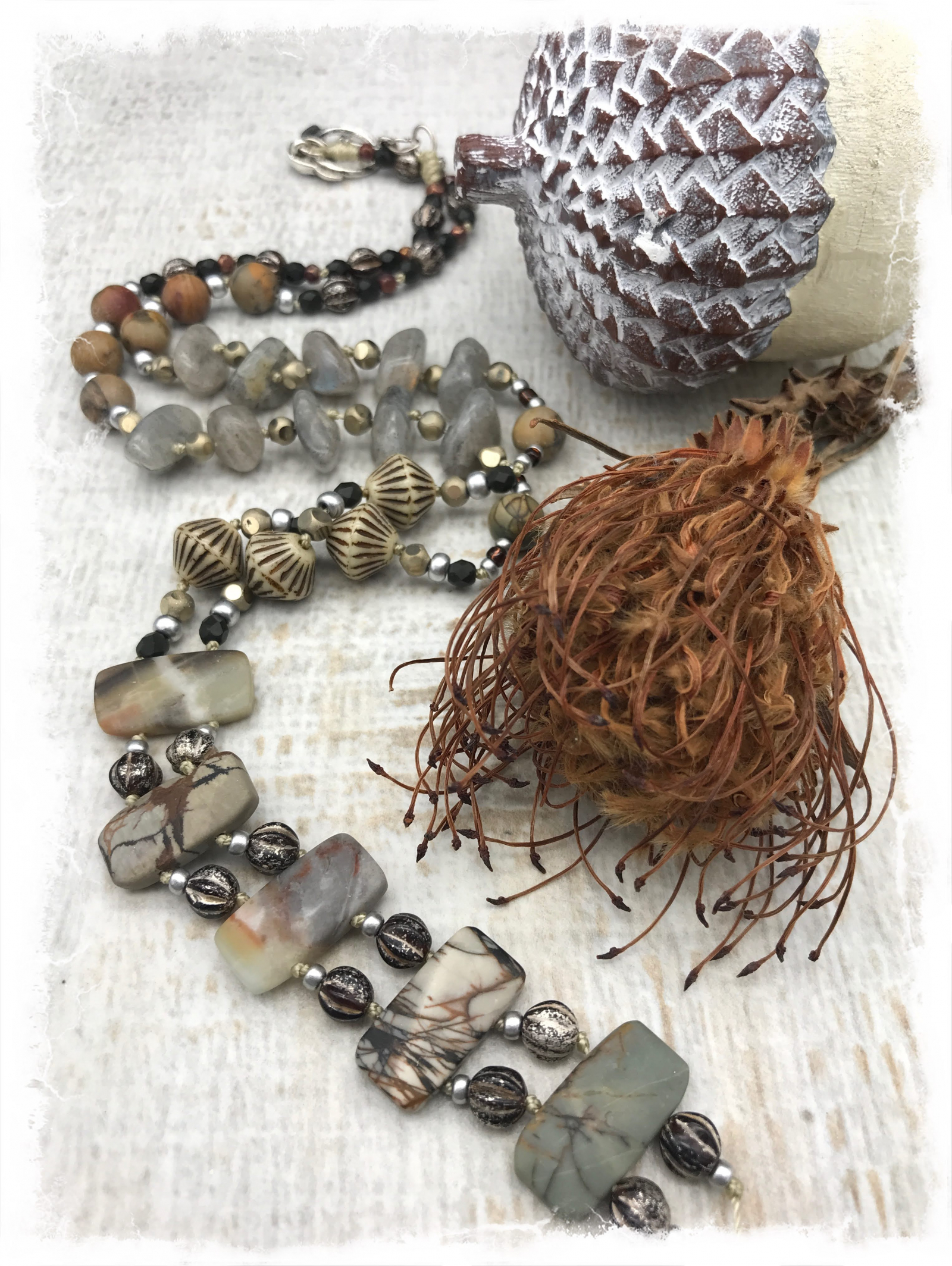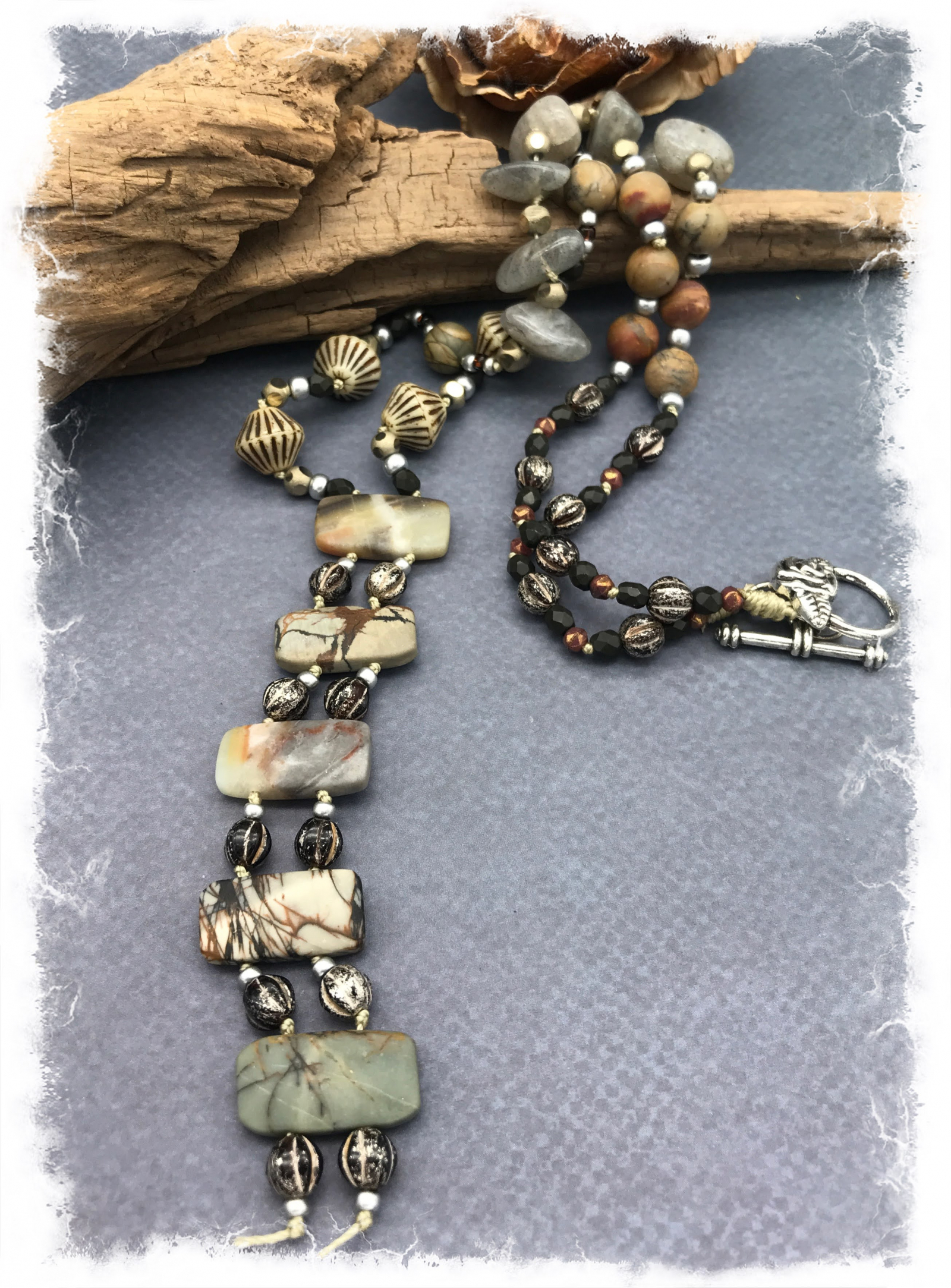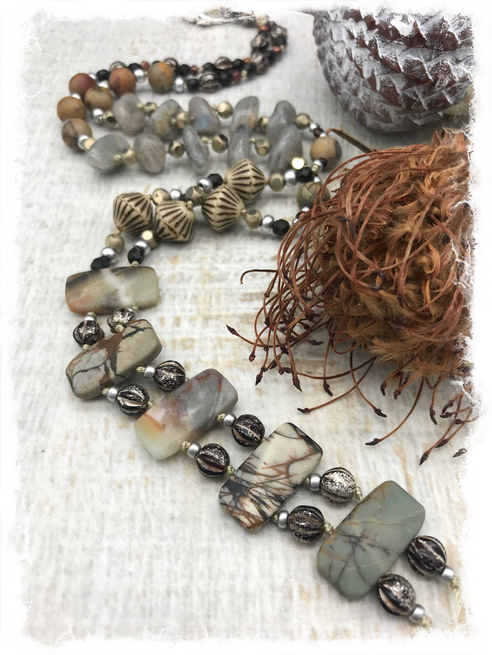 This is my signature Steppingstone design necklace that I created many years ago, after much trial and error in trying to use double-drilled stones. Our fantastic, local wholesale jewelry supplier Dakota Stones always has these in stock... surely there was some unique way to design them. I was thrilled with the first rendition, which I'm still wearing, and have loved making them ever since. This version has a very quiet, elegant palette, with really unique stones. The double drill at the base of the "Y" are a combination of picture jasper and matte black Amazonite, with chocolate/silver glass melon beads in between. Further along, there are gorgeous pebbles of labradorite with window faceted pale gold beads. There are also matte picture jasper rounds, Czech glass bicone beads with black etching, and silver seed beads. This hand-knotted beauty will go with just about anything! It's 31" long, and has an easy silver plated rosebud toggle. it takes many hours to know these lovelies, and the end result is worth the effort. Completely one-of-a-kind.