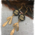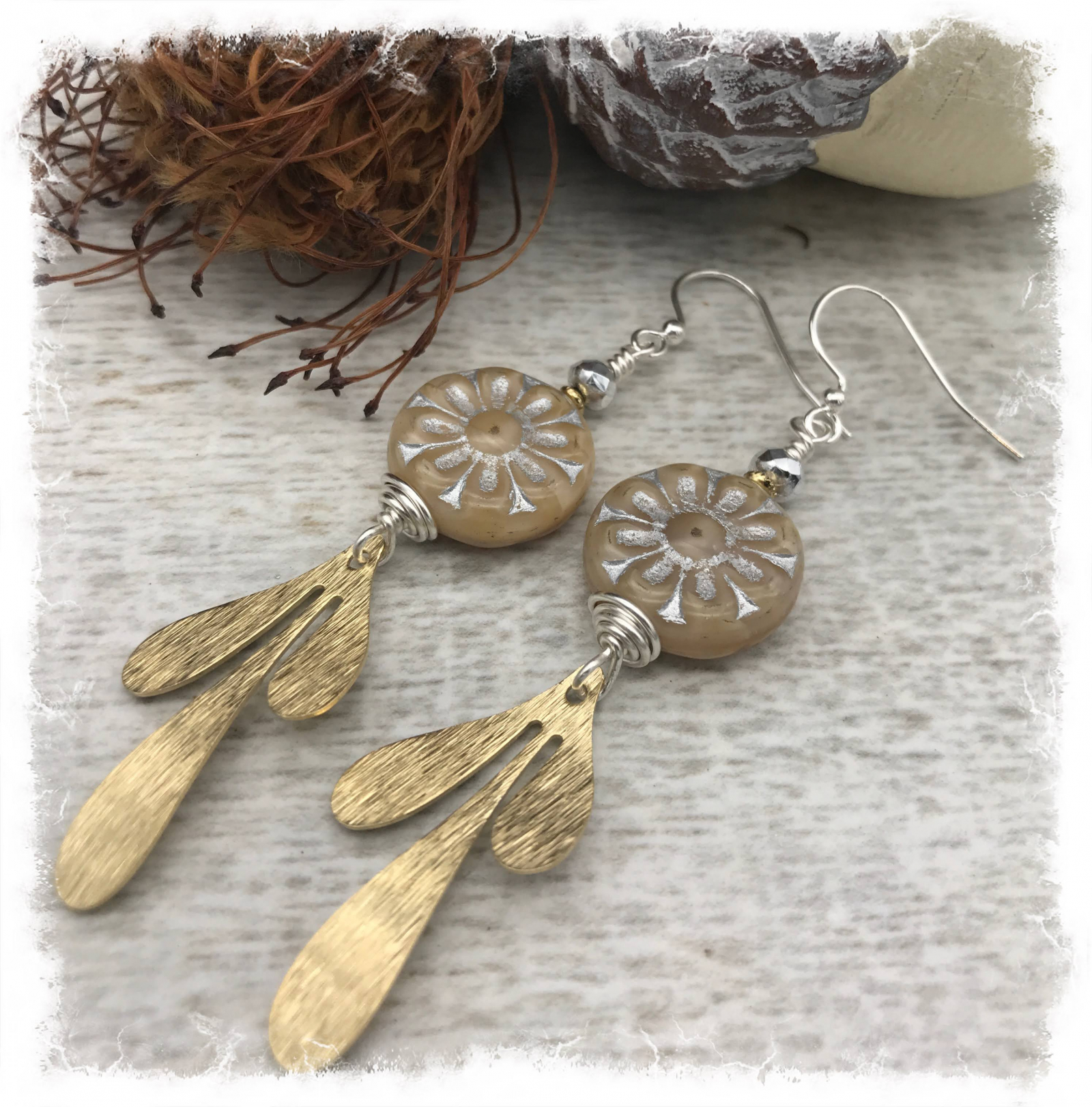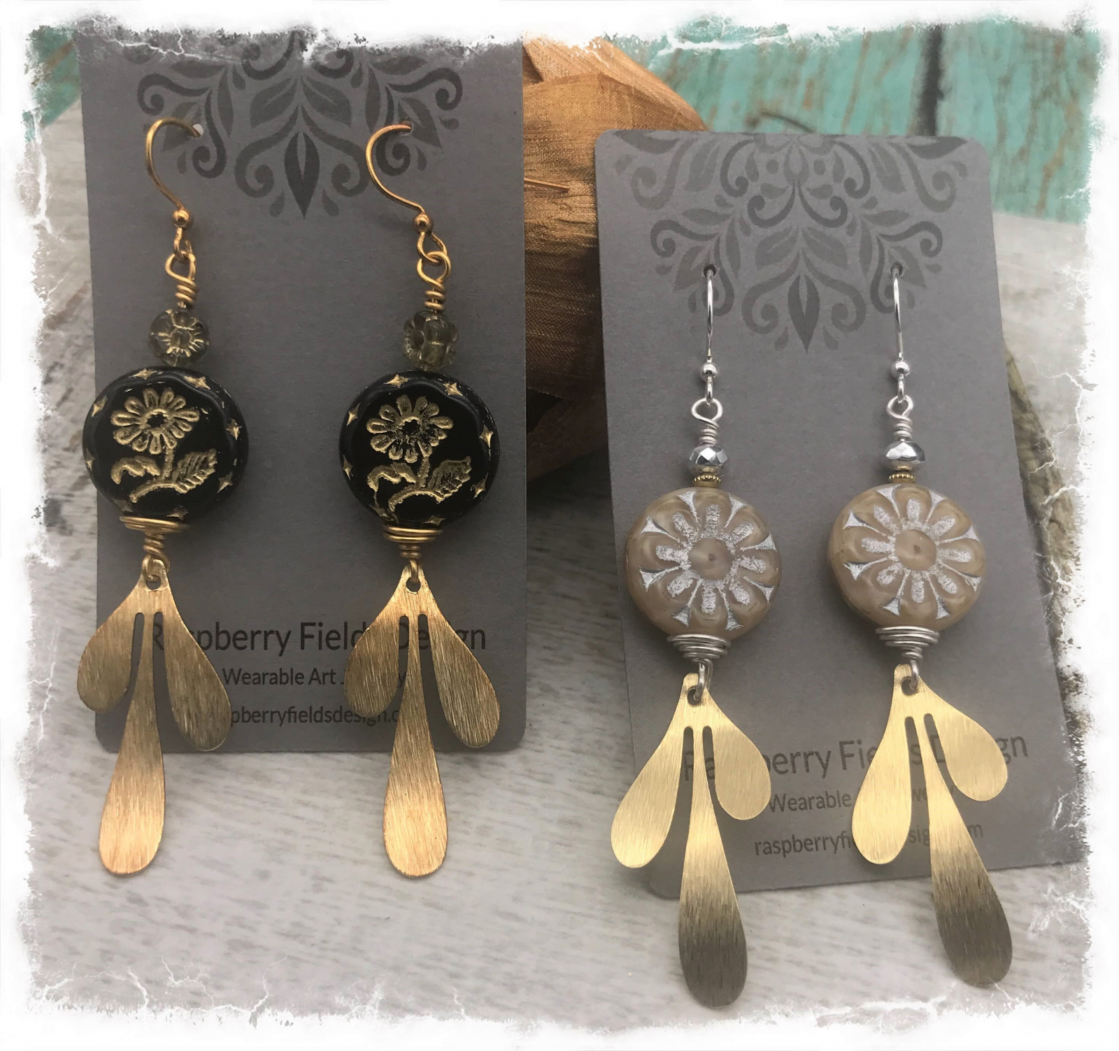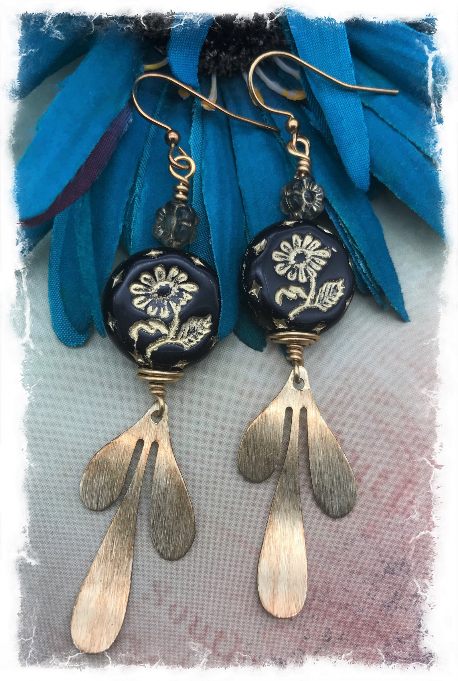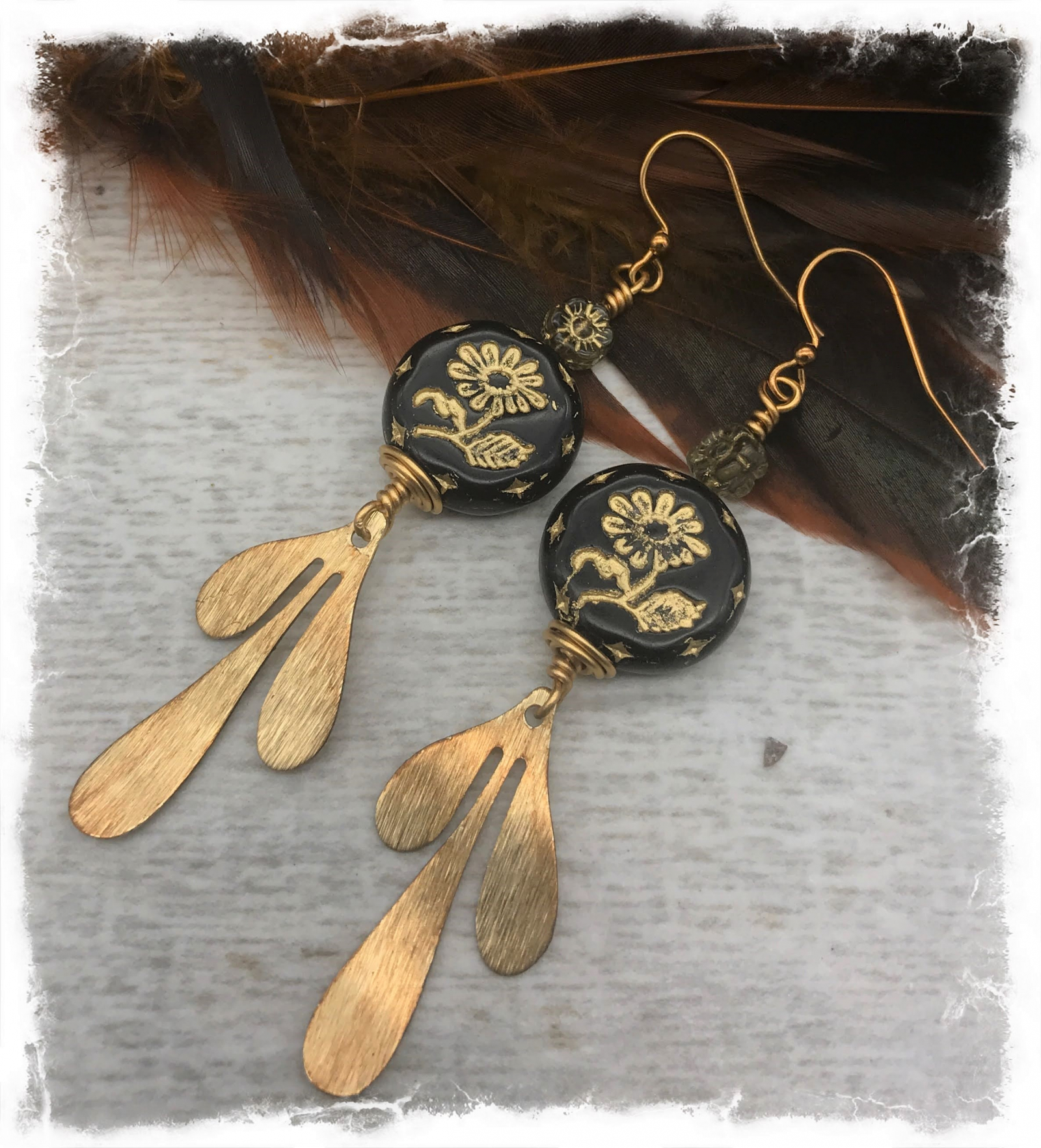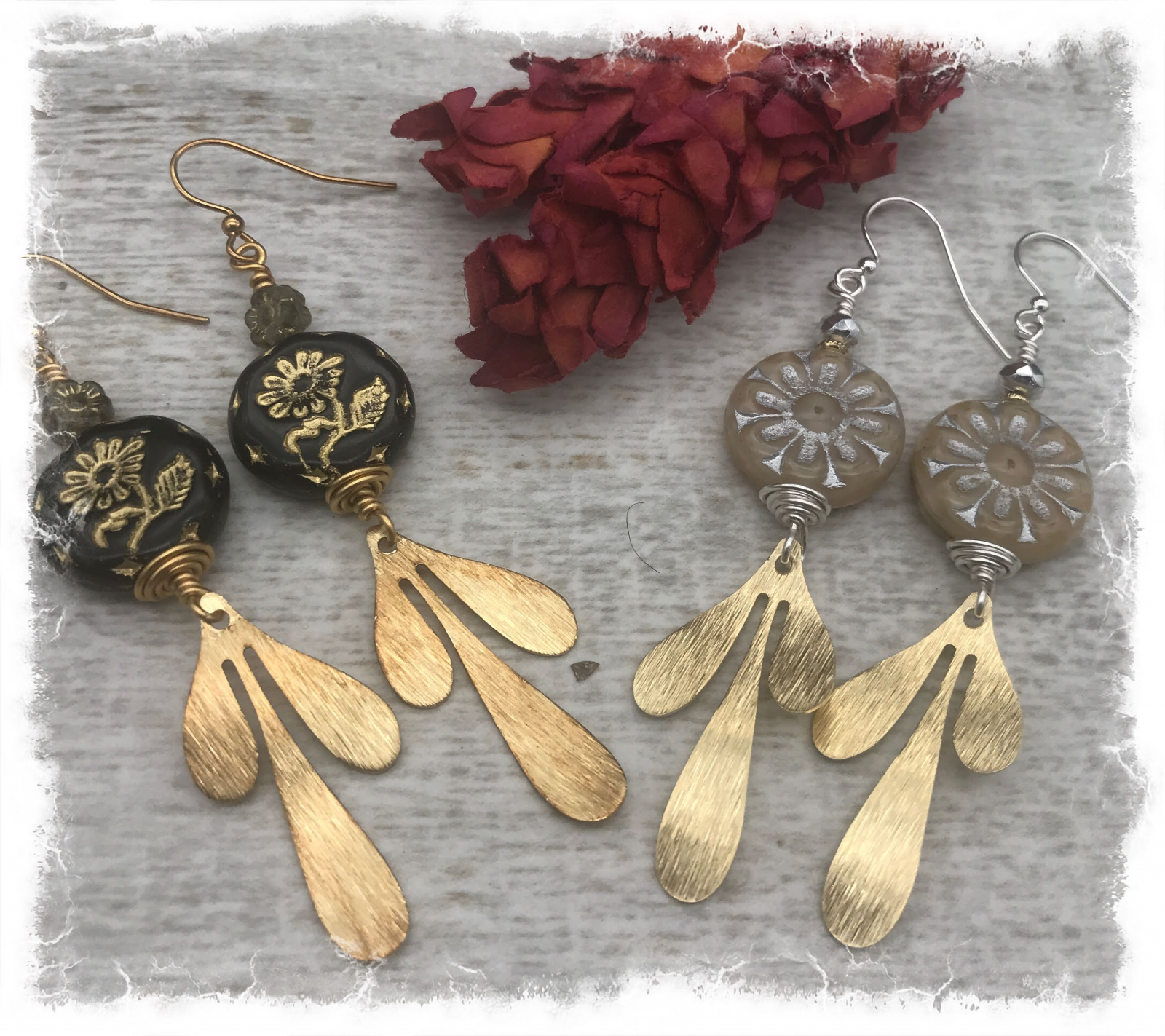 The etched brass leaf charms dangling at the bottom of these beautiful earrings are bold and yet graceful. They're such a unique shape, and the texture is terrific. Above each is a wonderful Czech glass coin bead. The stone pair has a silver washed flower design and is hand-wired in silver with matching ear wires. The black pair has a gorgeous gold etched flower and brass ear wires. The leaf has been hand painted in gold/bronze to pair well with the bead and findings. Both earring pairs measure about 2 1/4" including the ear hook. They are amazingly light to wear and have great movement. Perfect anytime! Please choose black or stone at checkout.