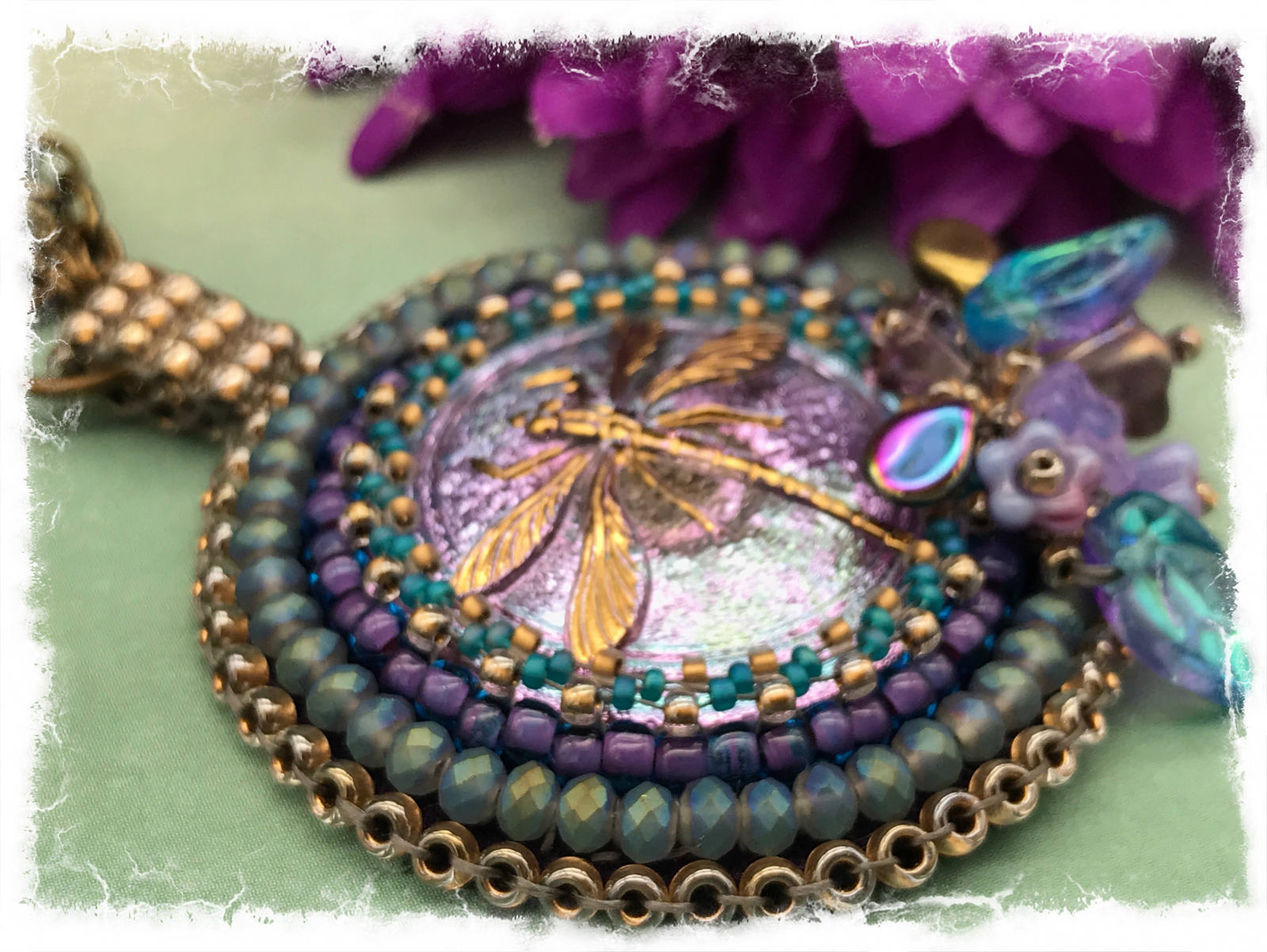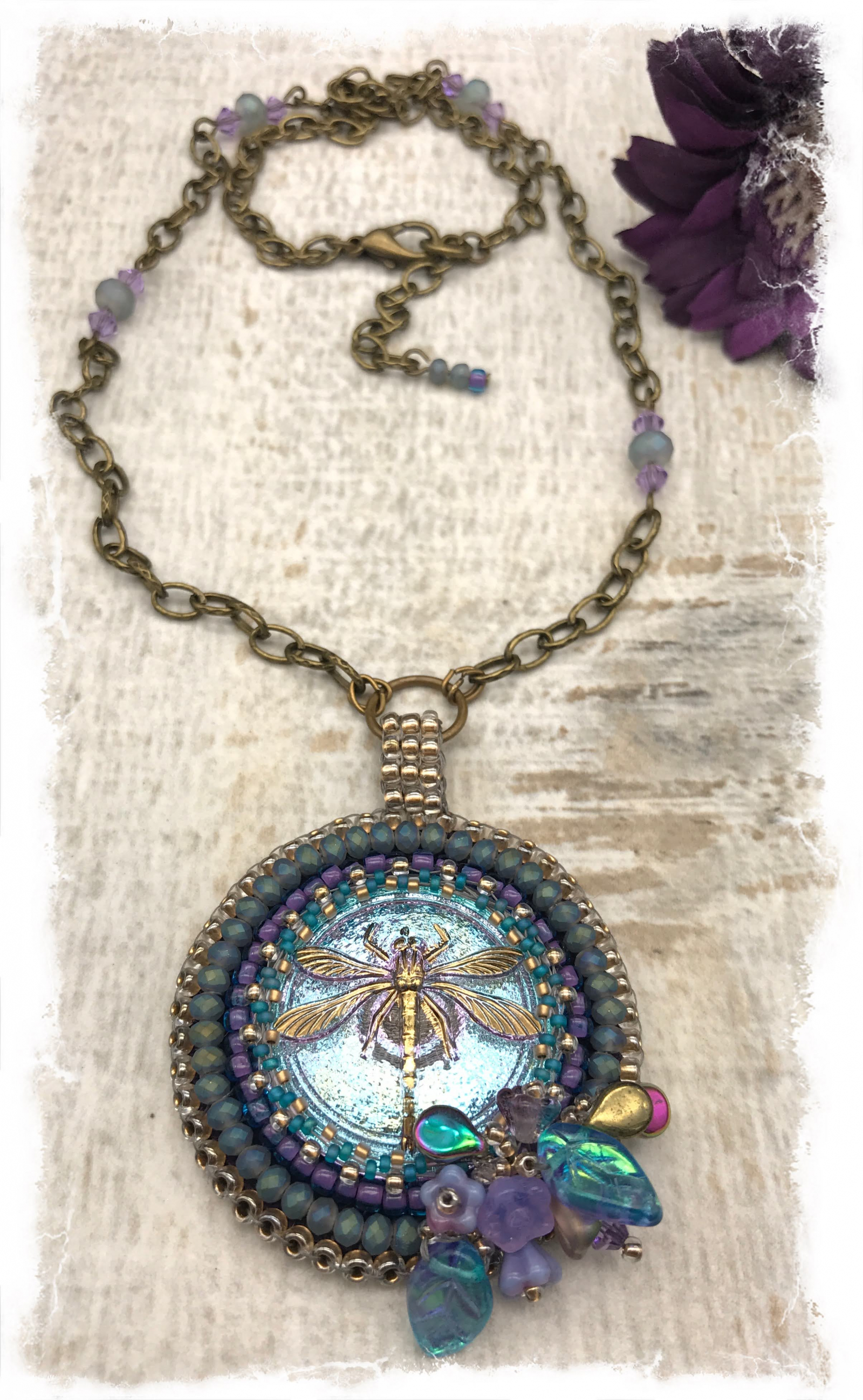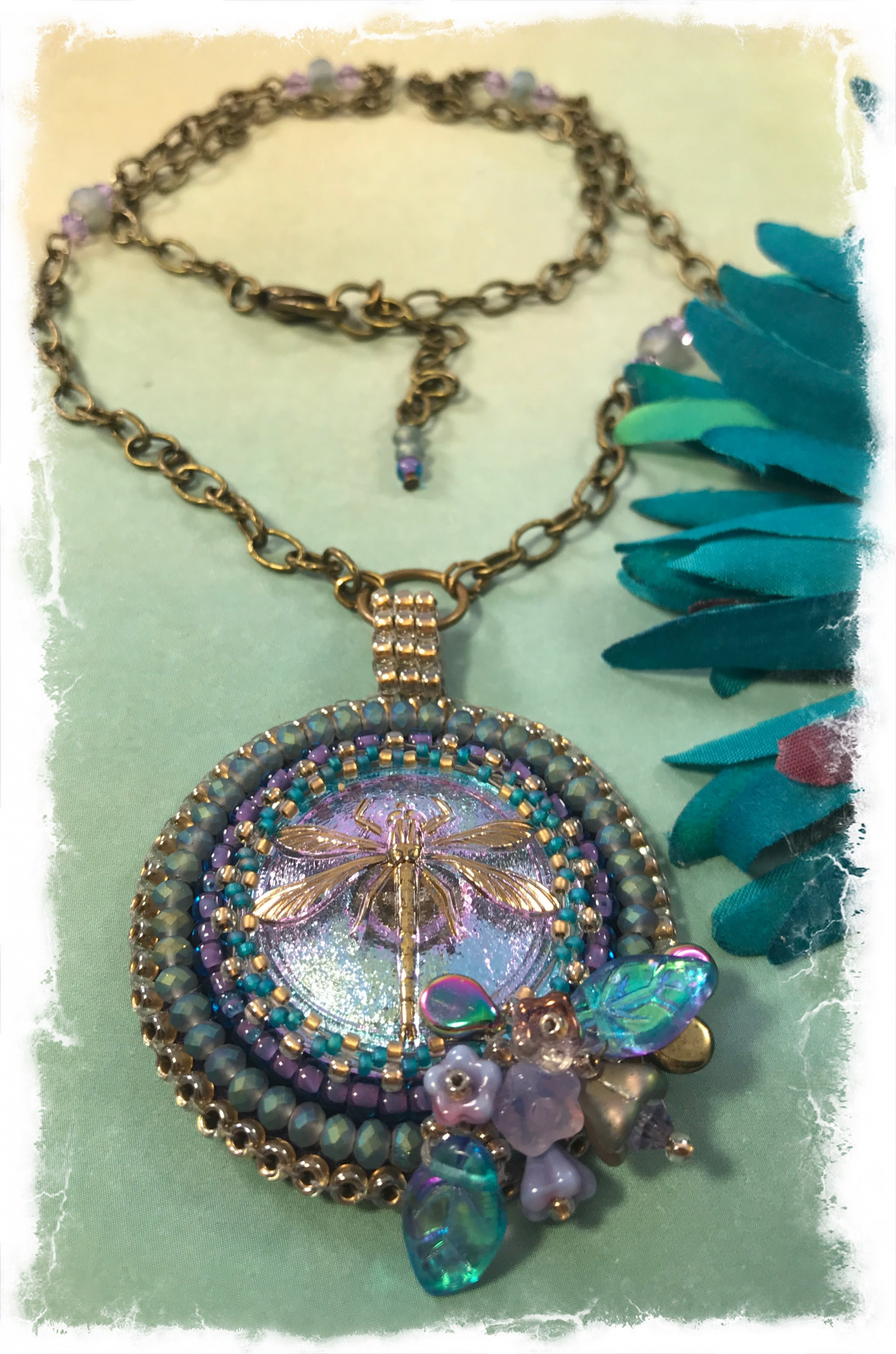 For centuries, dragonflies have symbolized new beginnings, living in the moment, adaptability, and finding inner peace. That's a lot for a tiny insect to balance on gossamer wings! I use them often in my jewelry designs, I like those positive vibes. This gorgeous hand painted Czech glass button embraces all of that with it's cool, ethereal color palette. The base is a beautiful rose violet and pale blue turquoise and the dragonfly is painted in antique gold. I've surrounded it with aqua-lined purple seed beads and tiny faceted blue crystals and finished the edge with soft gold seed beads. There's a hand-sewn flourish of Czech glass flowers, petals, and leaves that add some pretty embellishment. The brass chain has stations of faceted round and pale violet crystals. The twenty inch chain closes with a lobster claw clasp and has a 1 1/2" extender. The button pendant is about 1 3/4" wide. This would make a glorious gift for a gardener, or something lovely to remind you of warmer days and the beauty of real dragonflies.