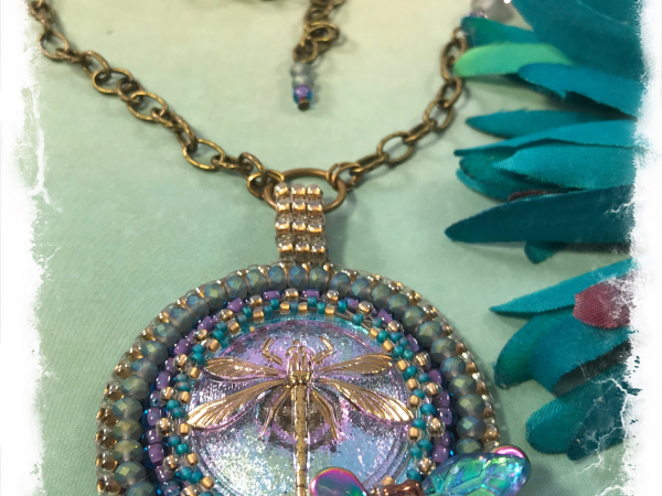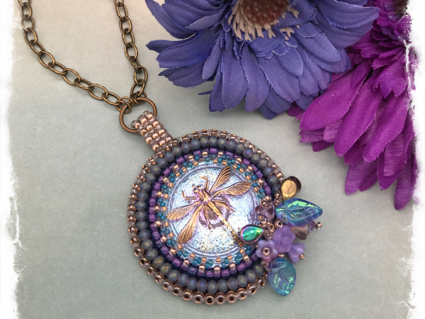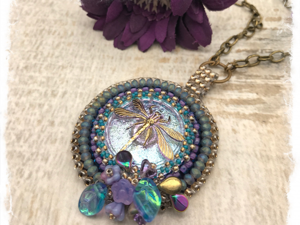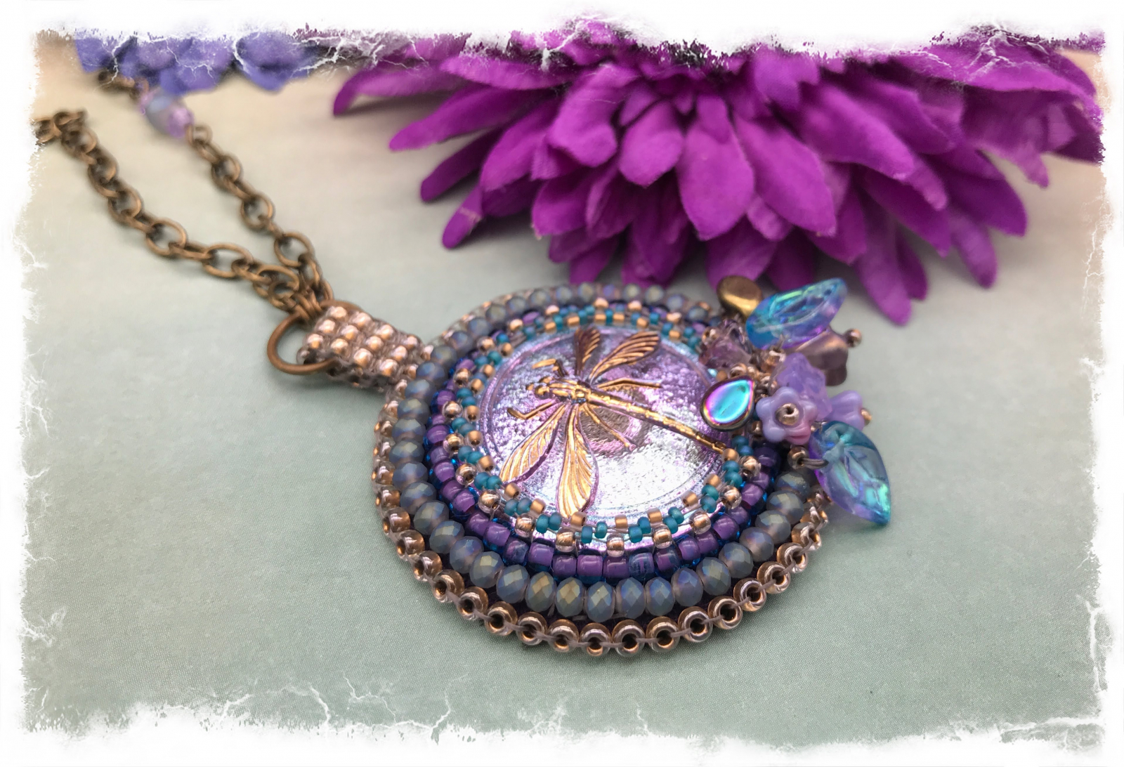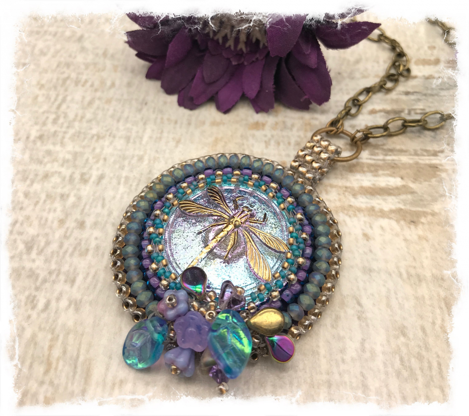 For centuries, dragonflies have symbolized new beginnings, living in the moment, adaptability, and finding inner peace. That's a lot for a tiny insect to balance on gossamer wings! I use them often in my jewelry designs, I like those positive vibes. This gorgeous hand painted Czech glass button embraces all of that with it's cool, ethereal color palette. The base is a beautiful rose violet and pale blue turquoise and the dragonfly is painted in antique gold. I've surrounded it with aqua-lined purple seed beads and tiny faceted blue crystals and finished the edge with soft gold seed beads. There's a hand-sewn flourish of Czech glass flowers, petals, and leaves that add some pretty embellishment. The brass chain has stations of faceted round and pale violet crystals. The twenty inch chain closes with a lobster claw clasp and has a 1 1/2" extender. The button pendant is about 1 3/4" wide. This would make a glorious gift for a gardener, or something lovely to remind you of warmer days and the beauty of real dragonflies.